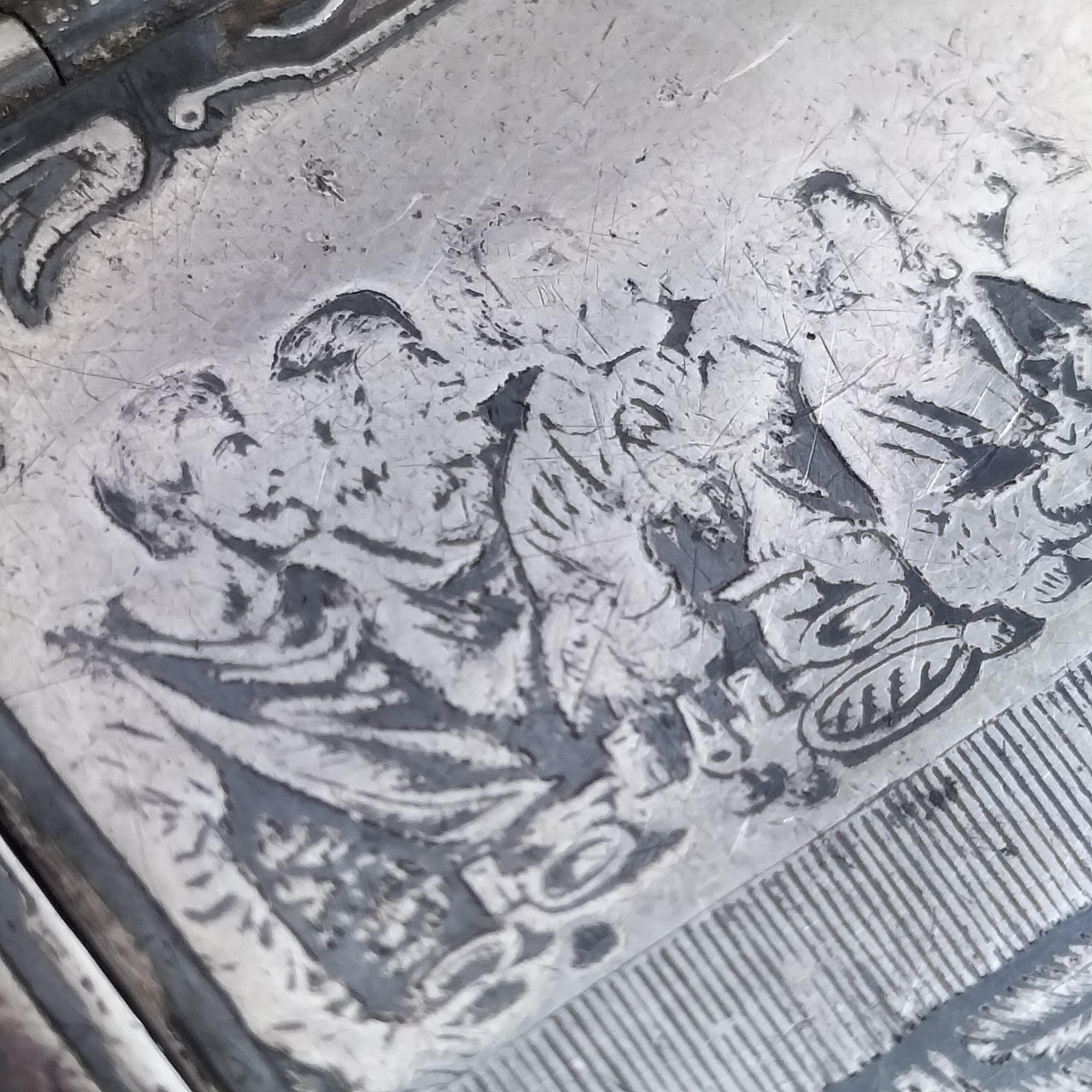 全体にニエロがあり、とても素敵な入れ物ですが表面にレオナルドダヴィンチの"最後の晩餐"の絵が手彫りで描かれています!
