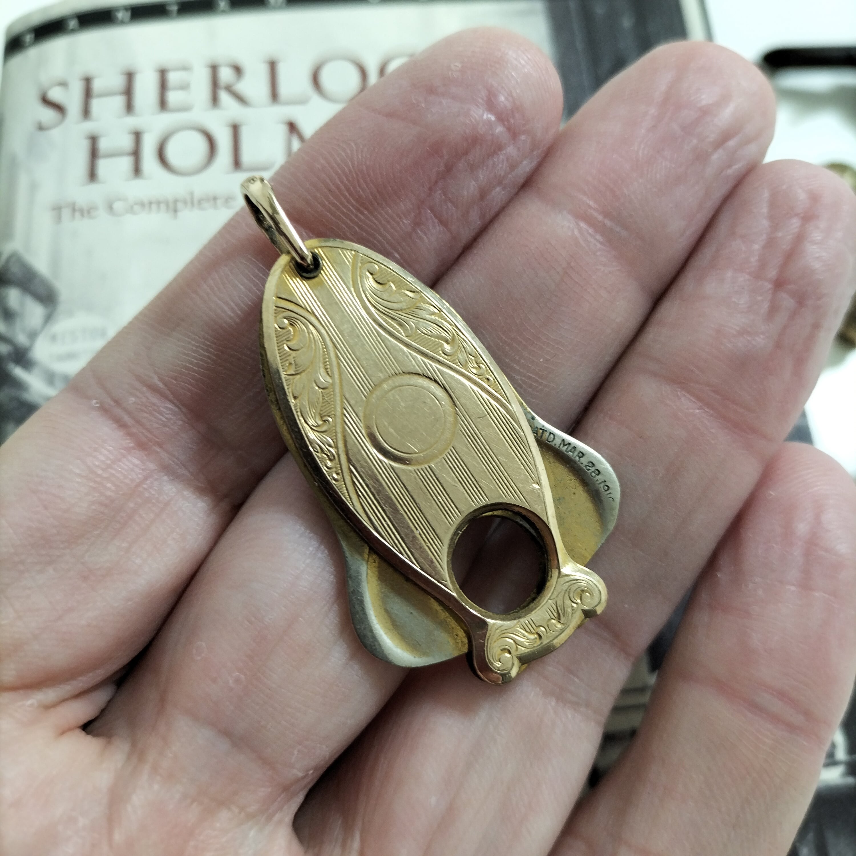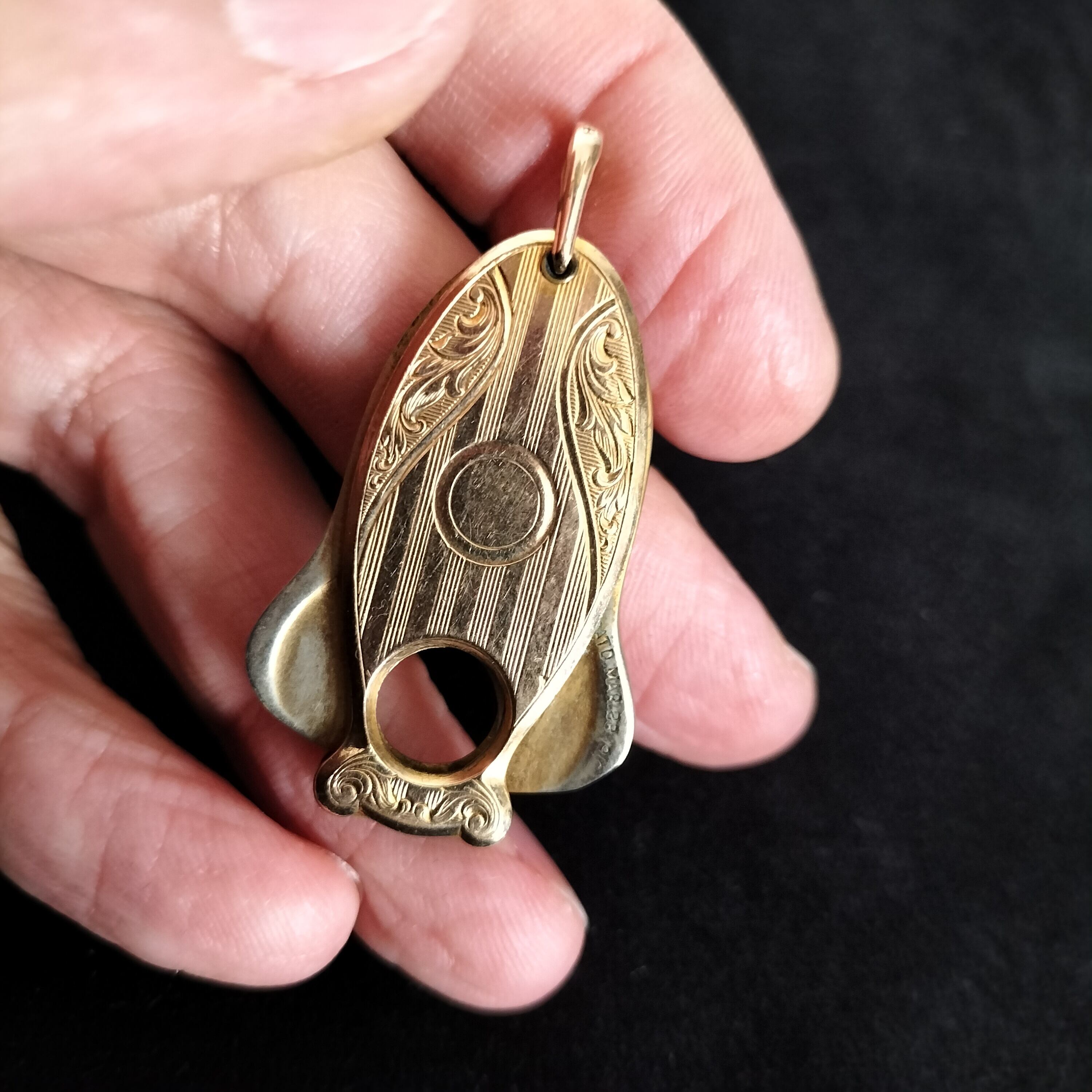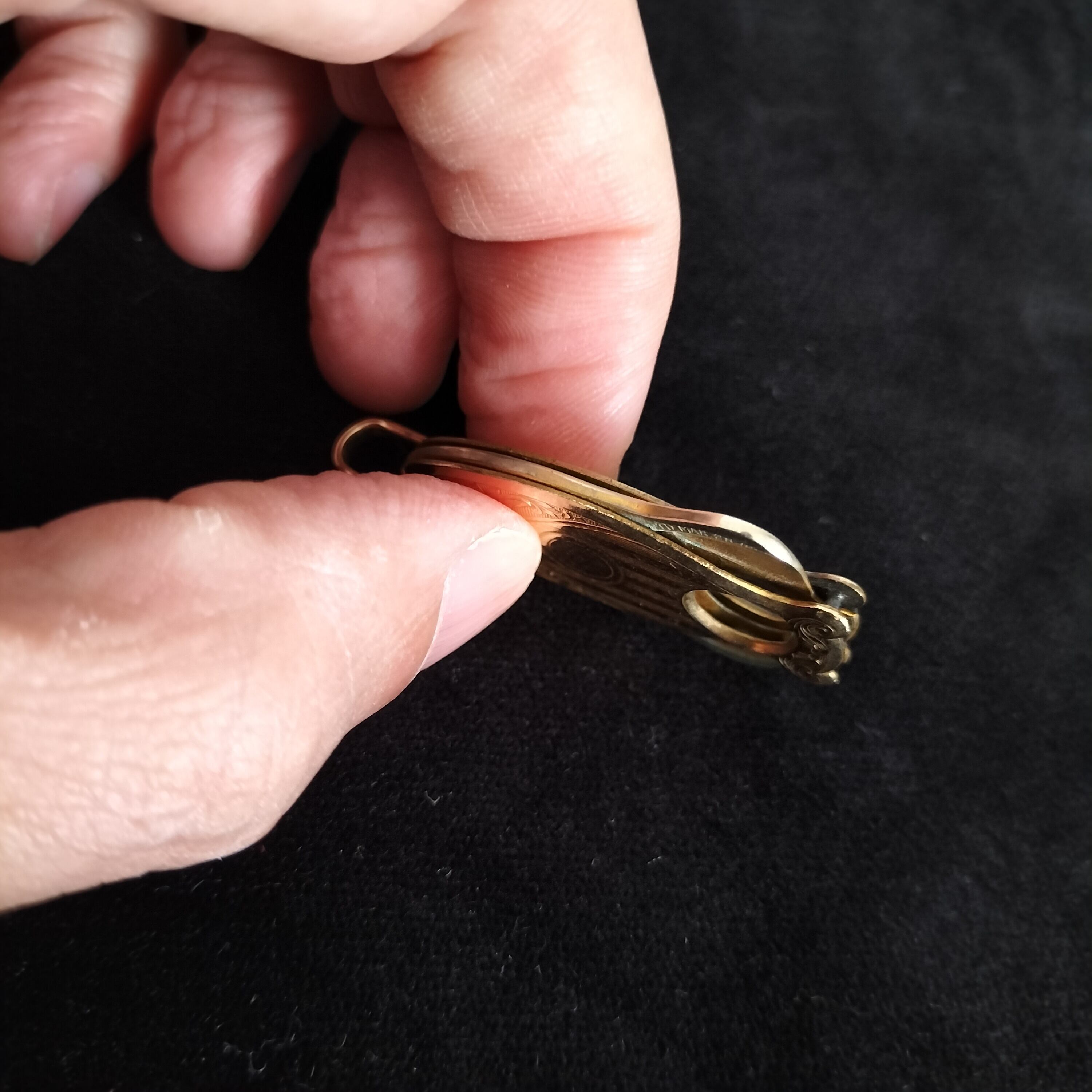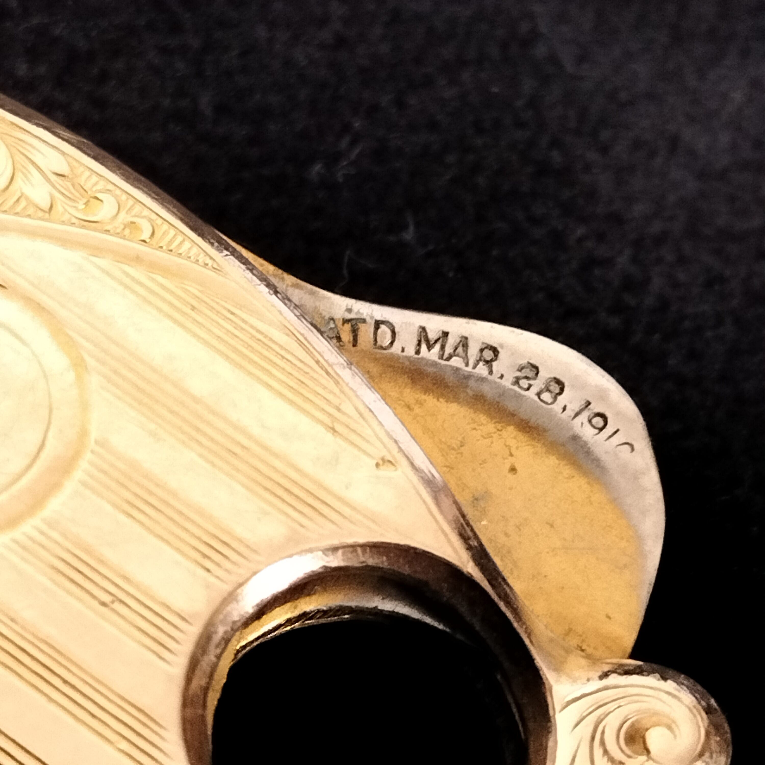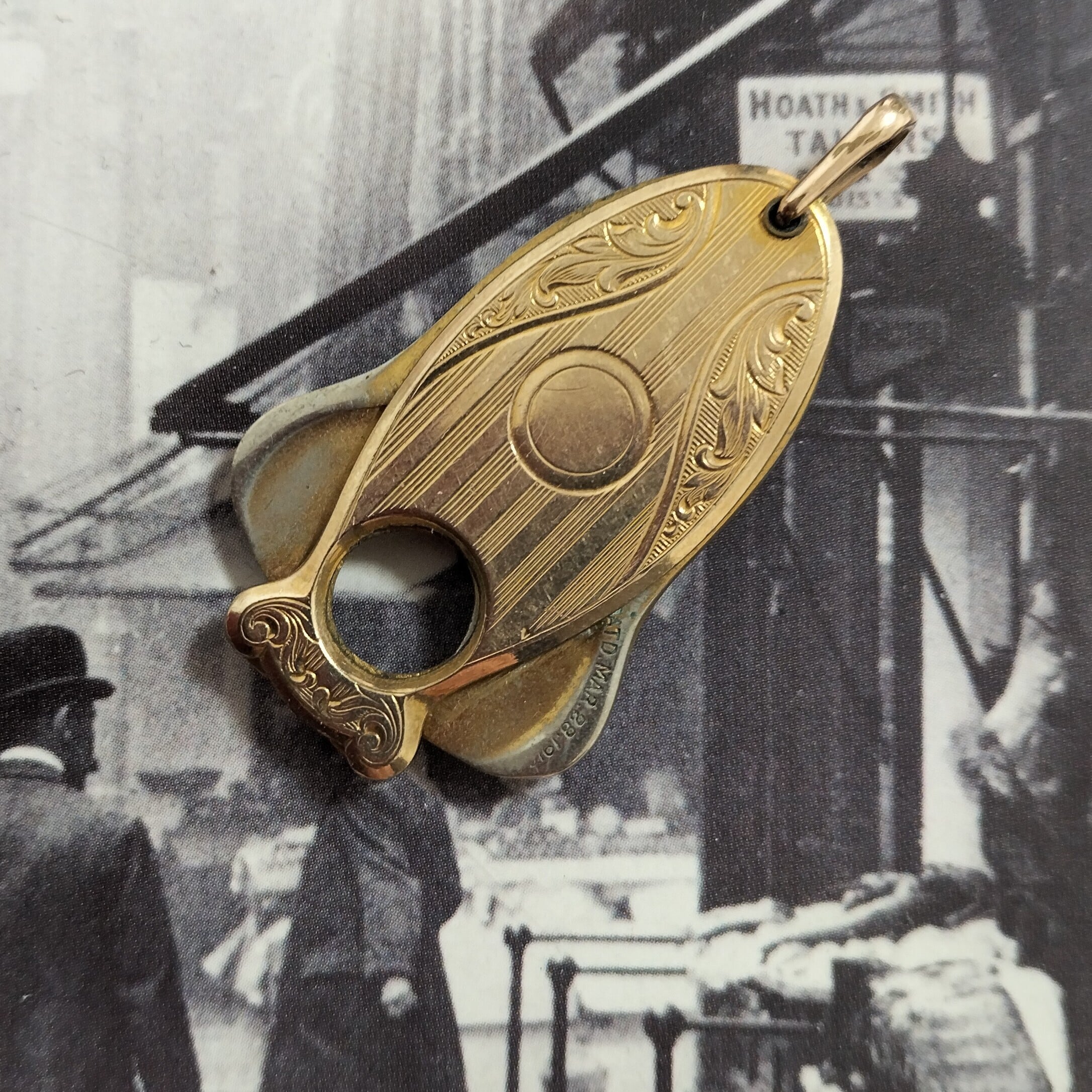 アメリカの20世紀初期のアンティークシガーカッターです。フォブペンダントとして懐中時計のチェーンにも、キーホルダーにも付けられていたそうです。刻印により、パテントナンバーが1910年です。本体の両面が金張りです(おそらく10金)。