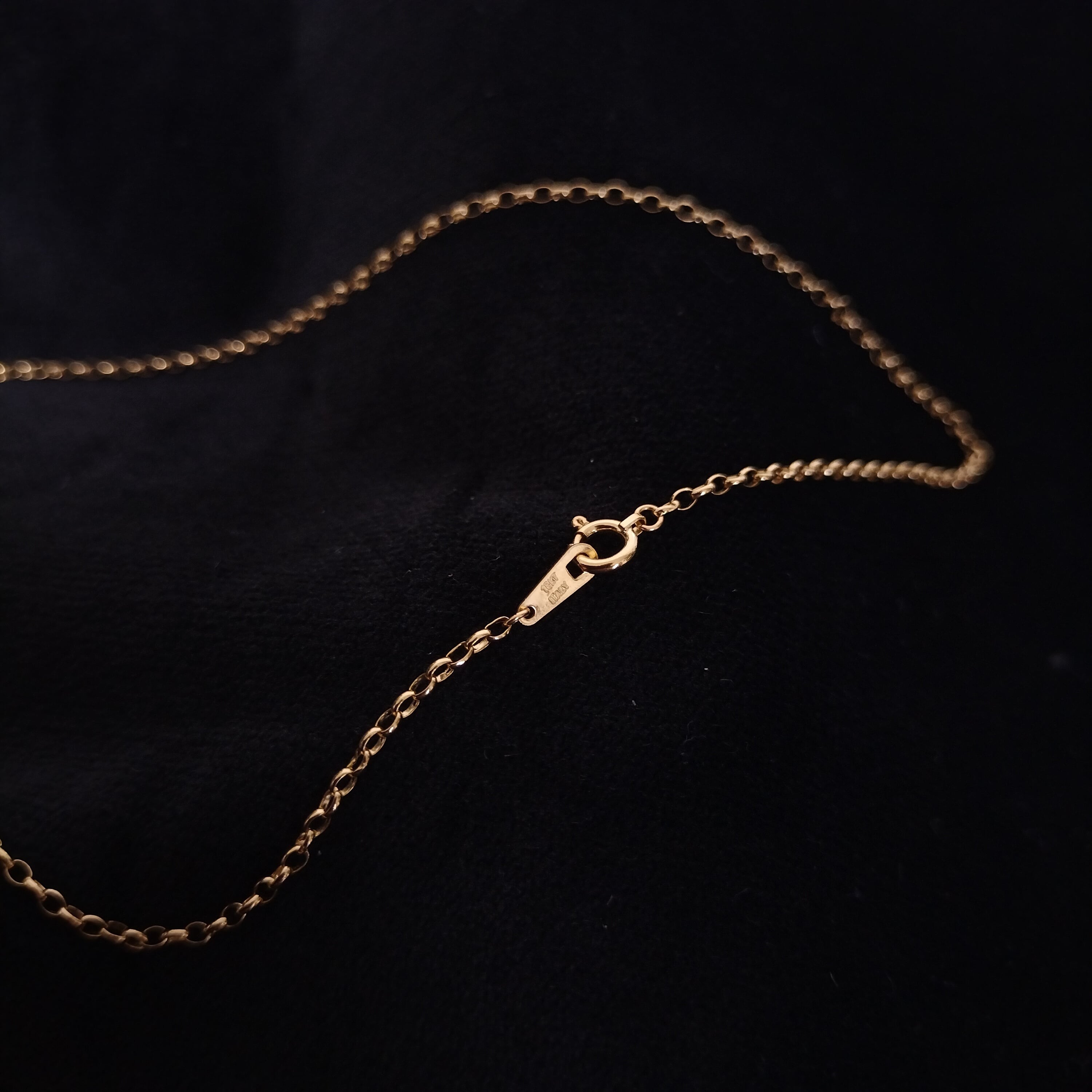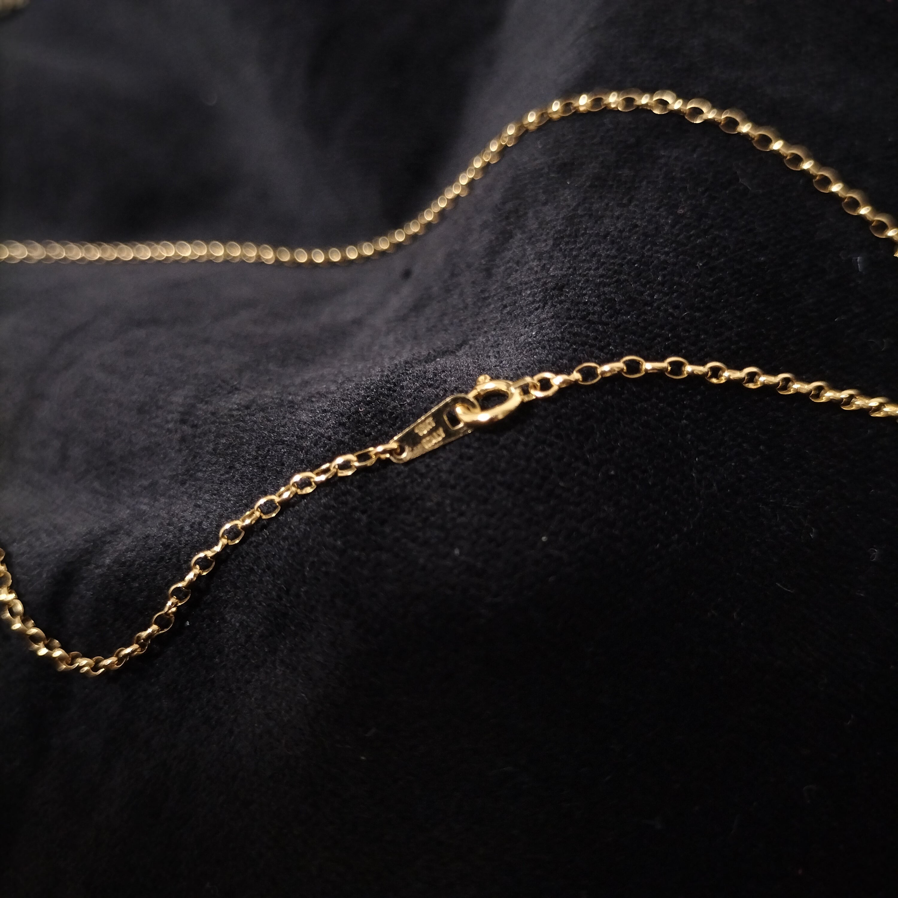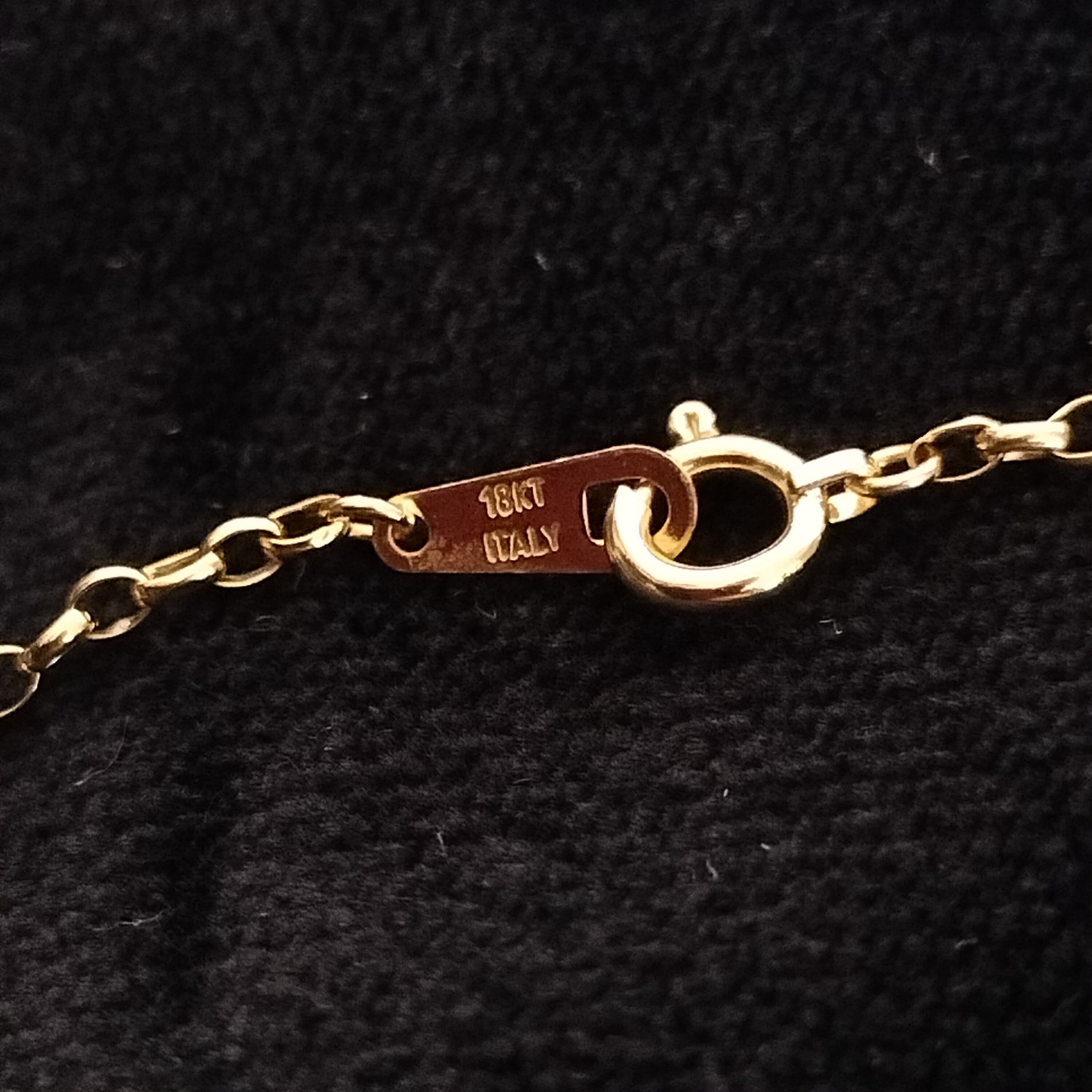 ゴールド「18KT」(18金)の刻印があり、全体の長さは40.5センチです(フック込み)。