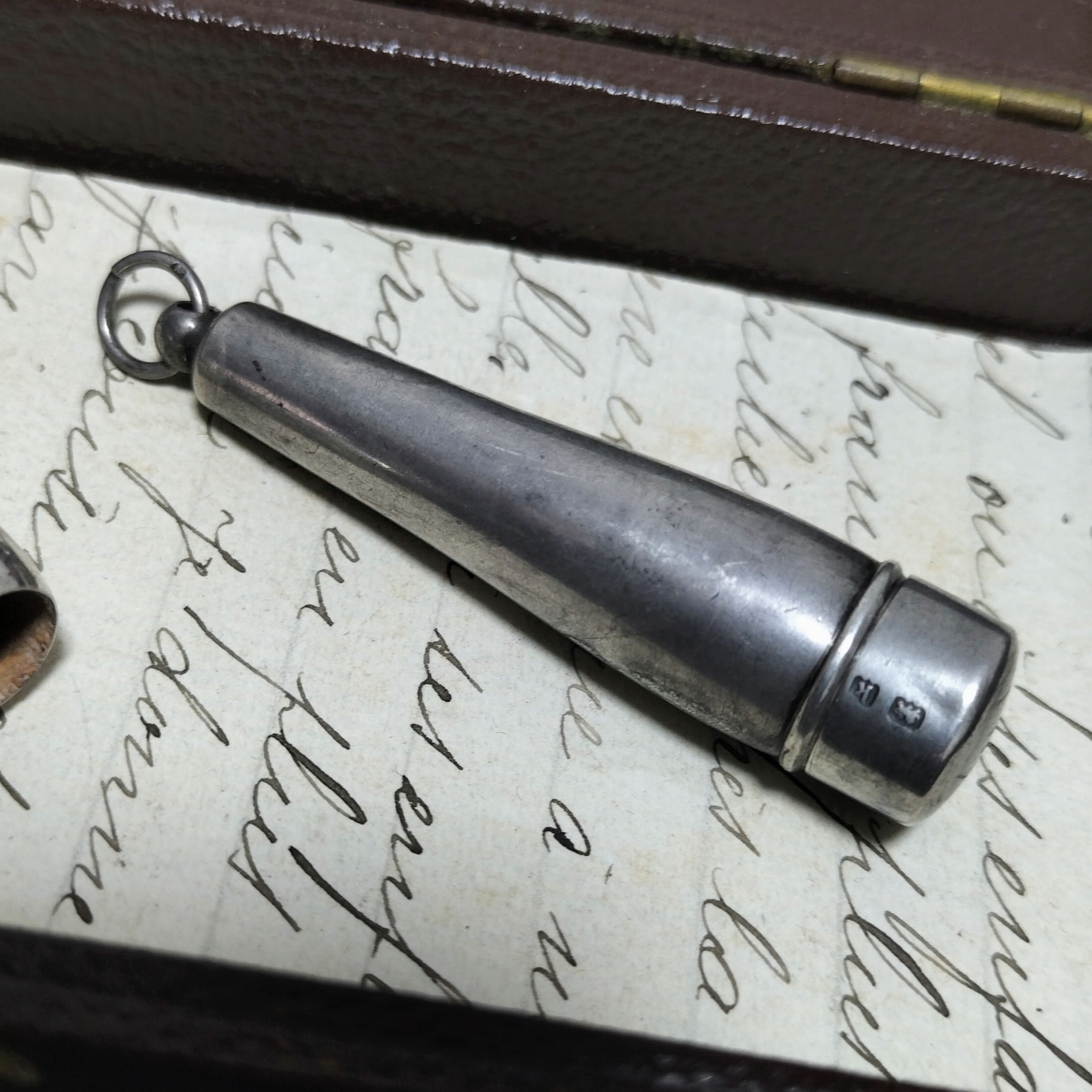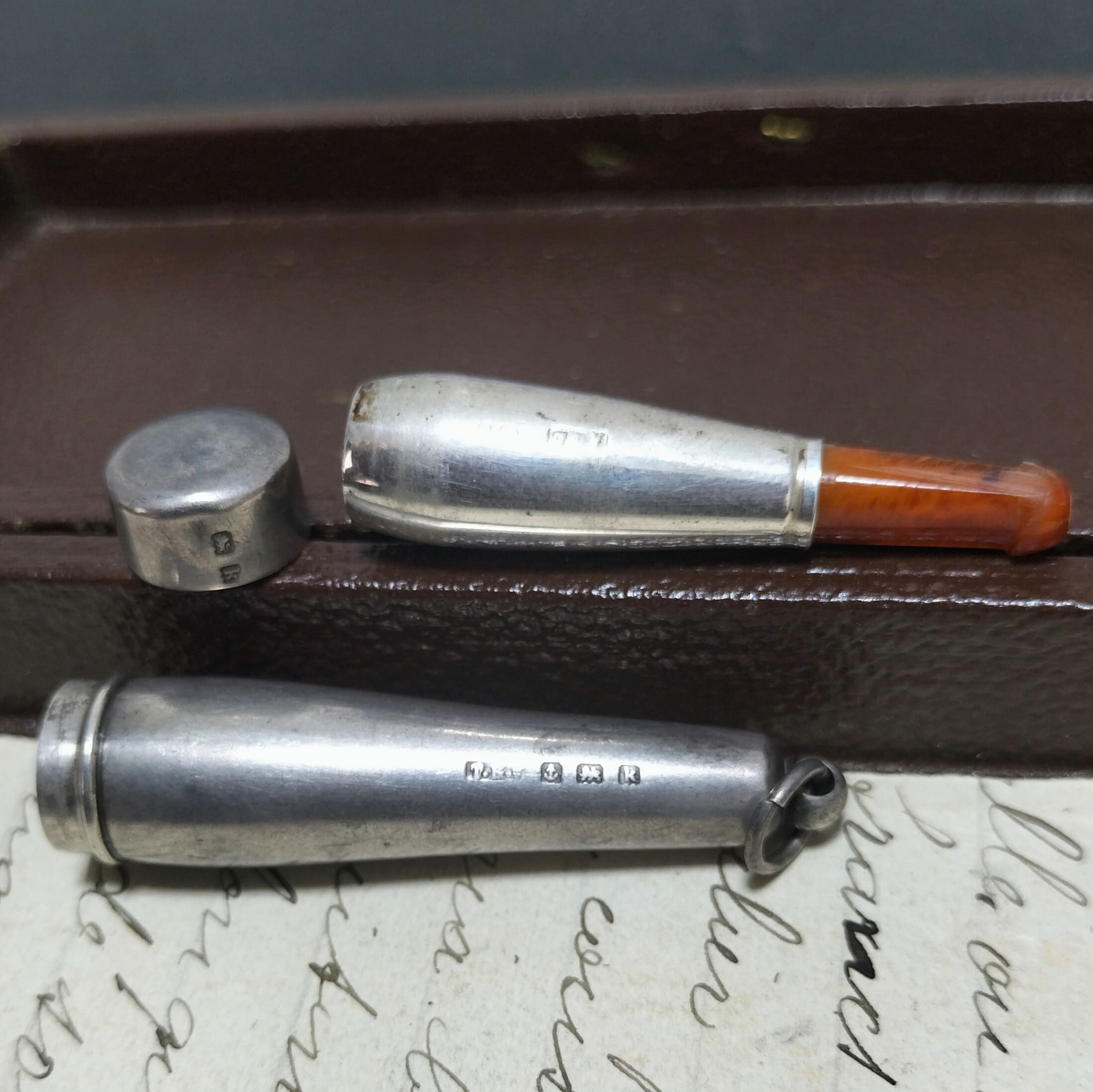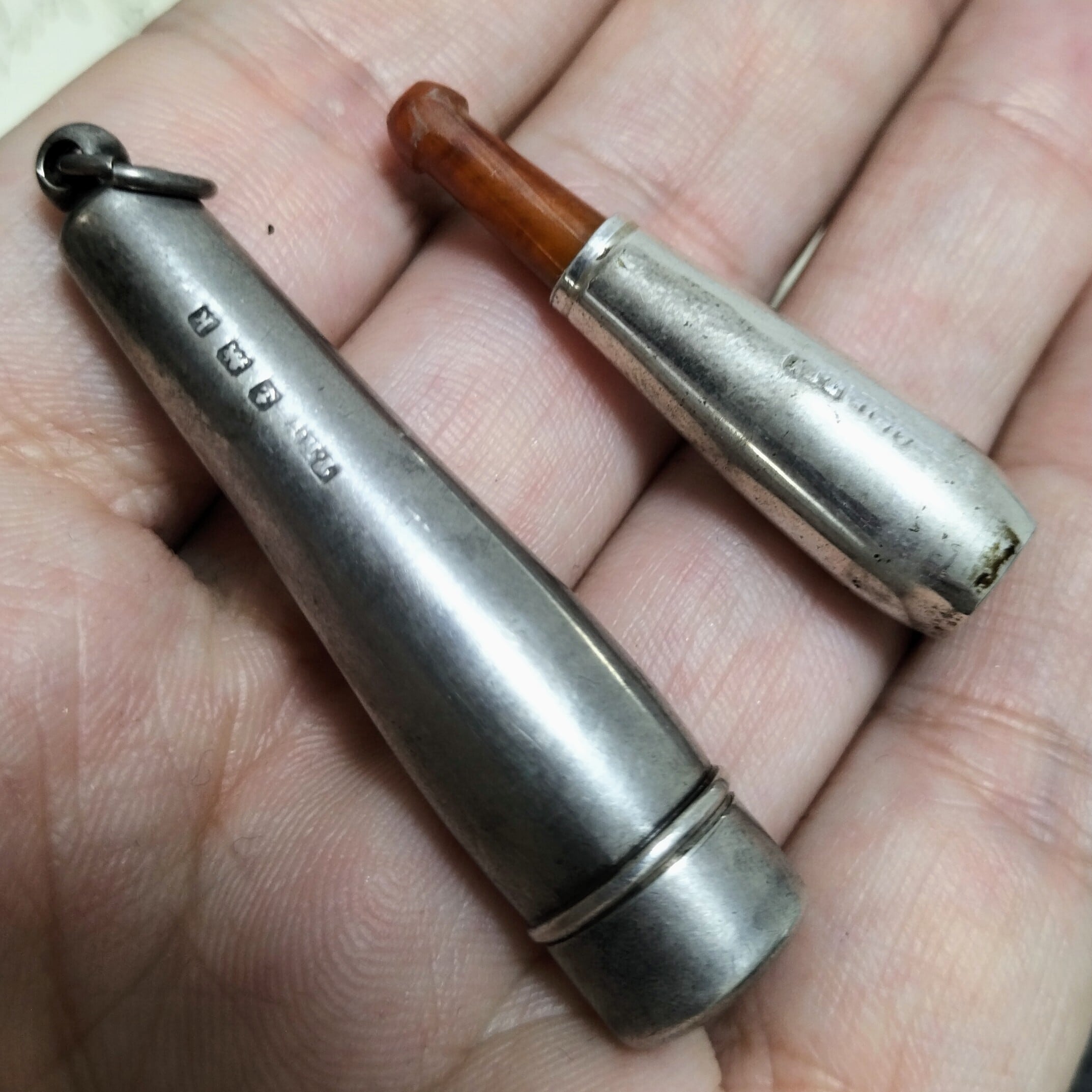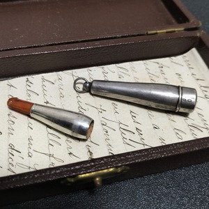 ホールマーク(刻印)より、1909年イギリスのバーミンガムで作られたスターリングシルバー製のタバコ用のマウスピースとケースです。マウスピースがシュガレットや葉巻にフィルターの代わりに付けるモノです。携帯用ですが、いつでも利用するためにシルバー製のケースに入り、よく懐中時計のチェーンにつけられていたモノです。マウスピースやケースがスターリングシルバー製ですがマウスピースのオレンジ色の部分の素材が樹脂製に見えます。