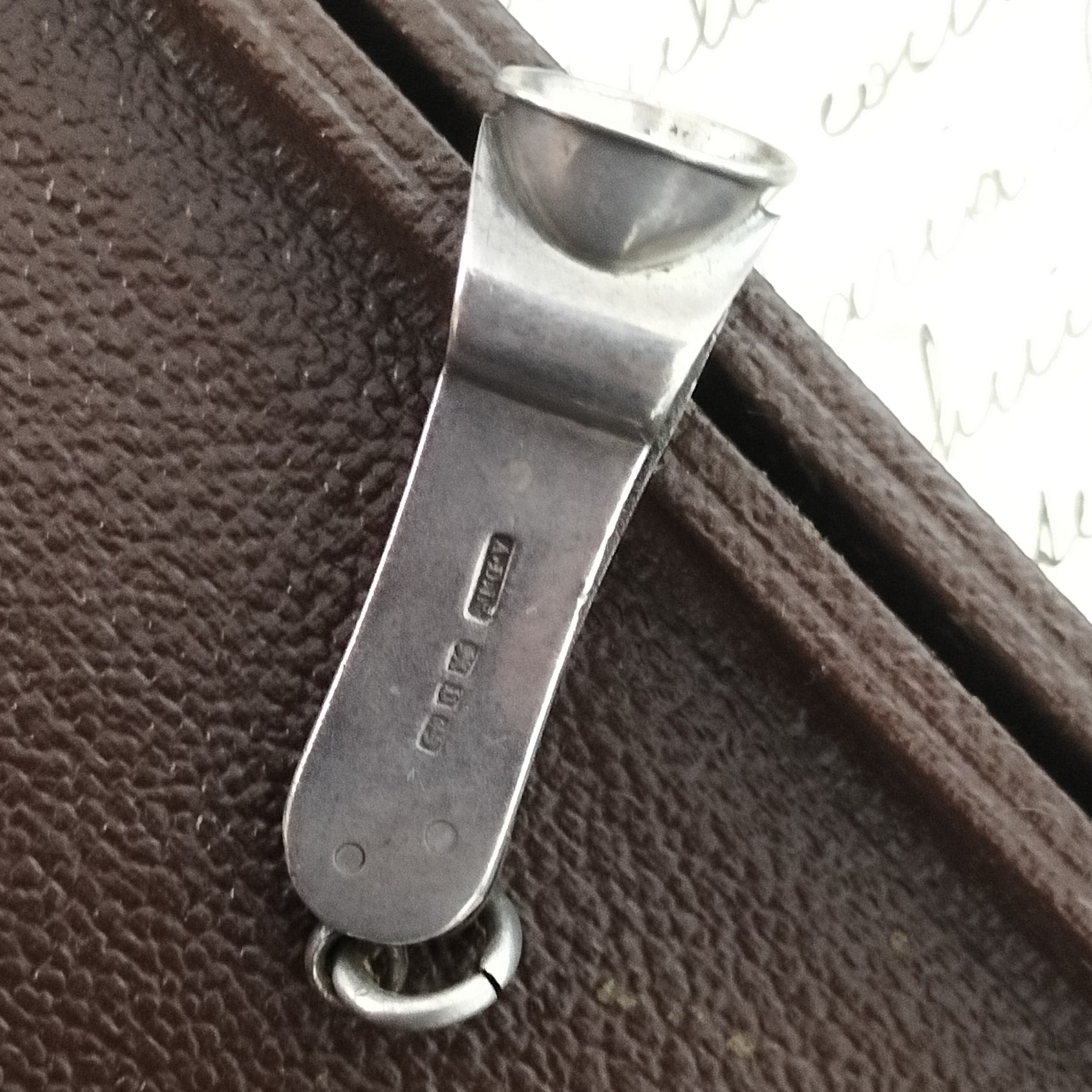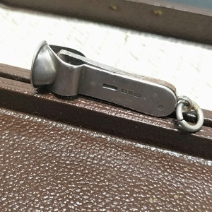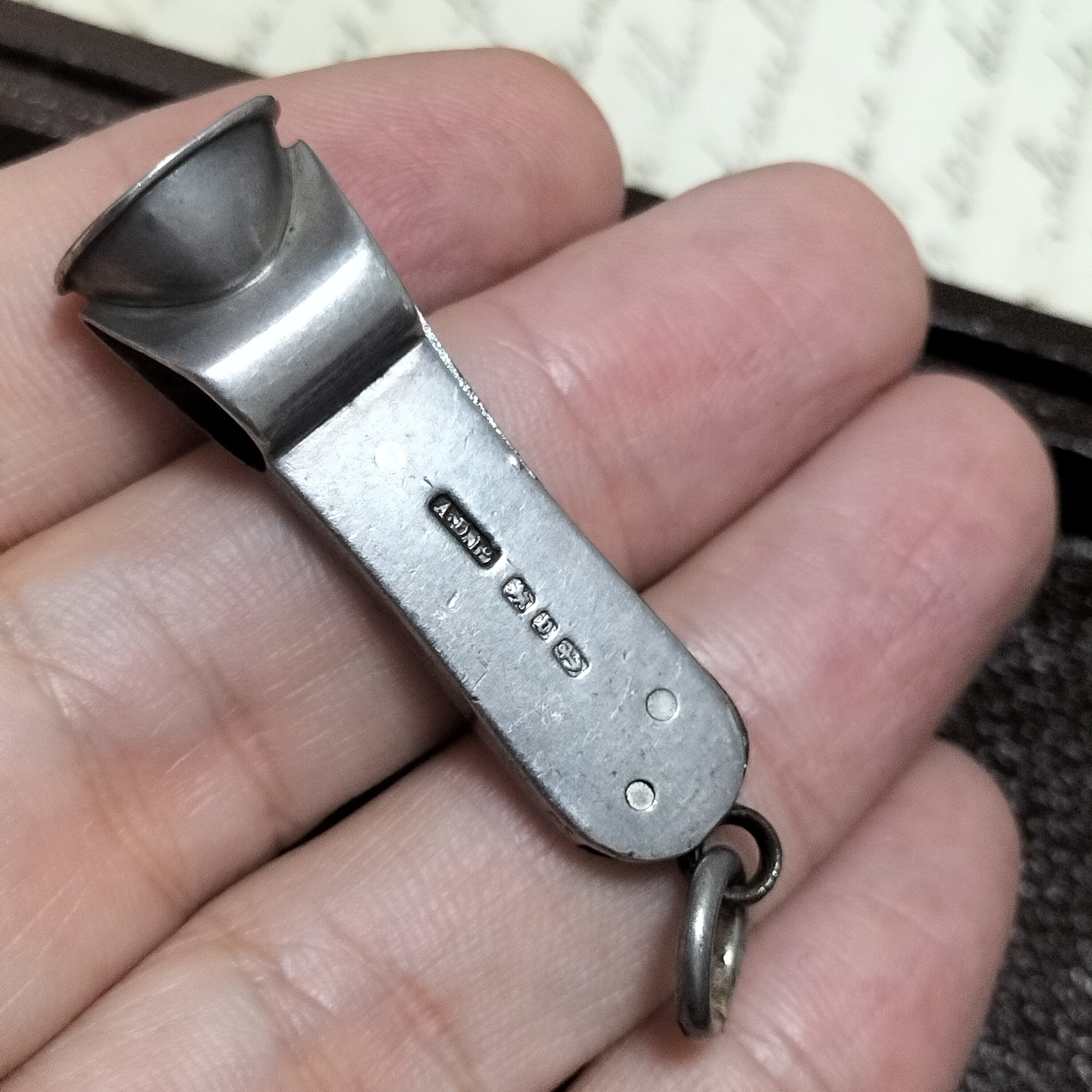イギリスのアンティークスターリングシルバー製シガーカッターです。フォブペンダントとして懐中時計のチェーンにも、キーホルダーにも付けられていたそうです。刻印により、1895年イギリスのバーミンガムで作られたカッターです。刃の部分以外、全体スターリングシルバー製です。