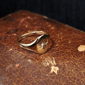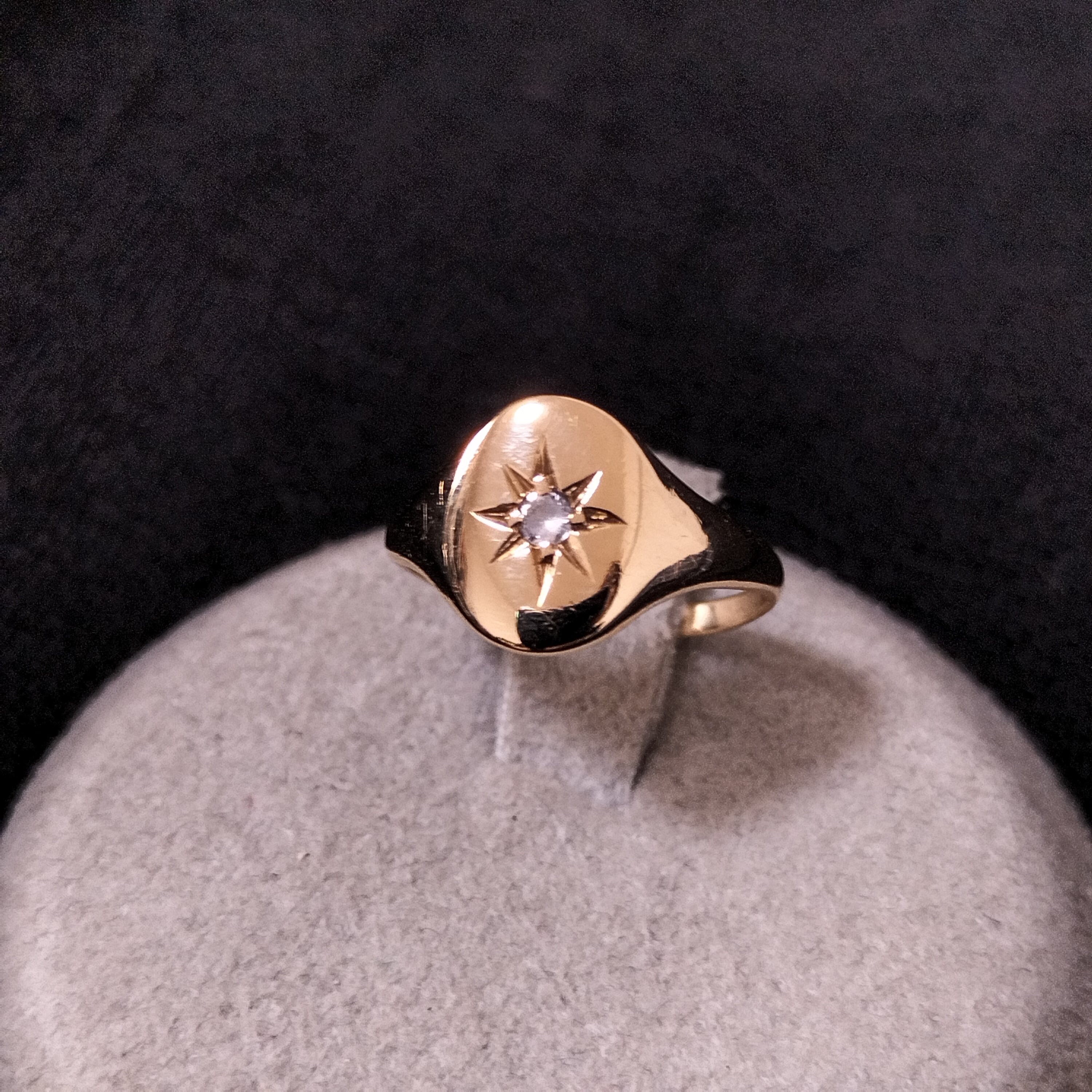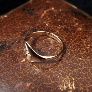 リングの内側にあるホールマーク(刻印)より、9ct(9金)のゴールドで作られました(1980年、シェフィルド、イギリス)。センターの石がキュービックジルコニアだと思われます。