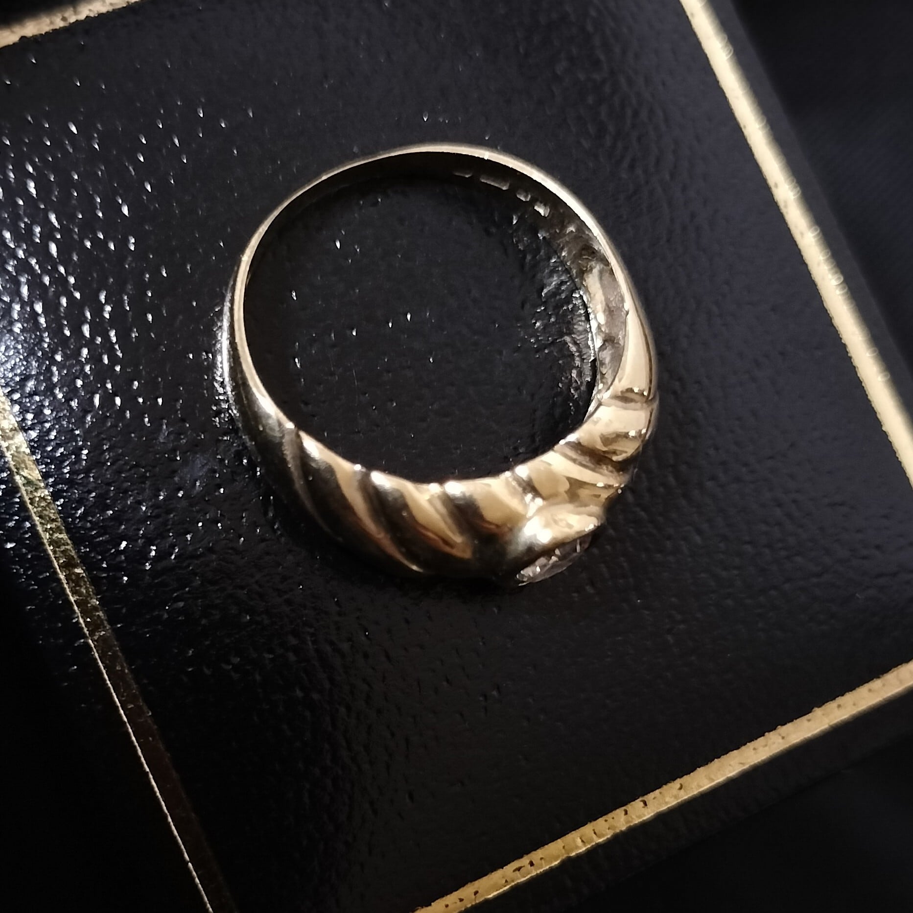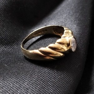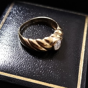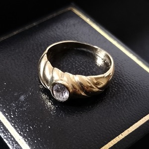 リングの内側にあるホールマーク(刻印)より、9ct(9金)のゴールドで作られました(1986年、ロンドン、イギリス)。センターの石がキュービックジルコニアだと思われます。