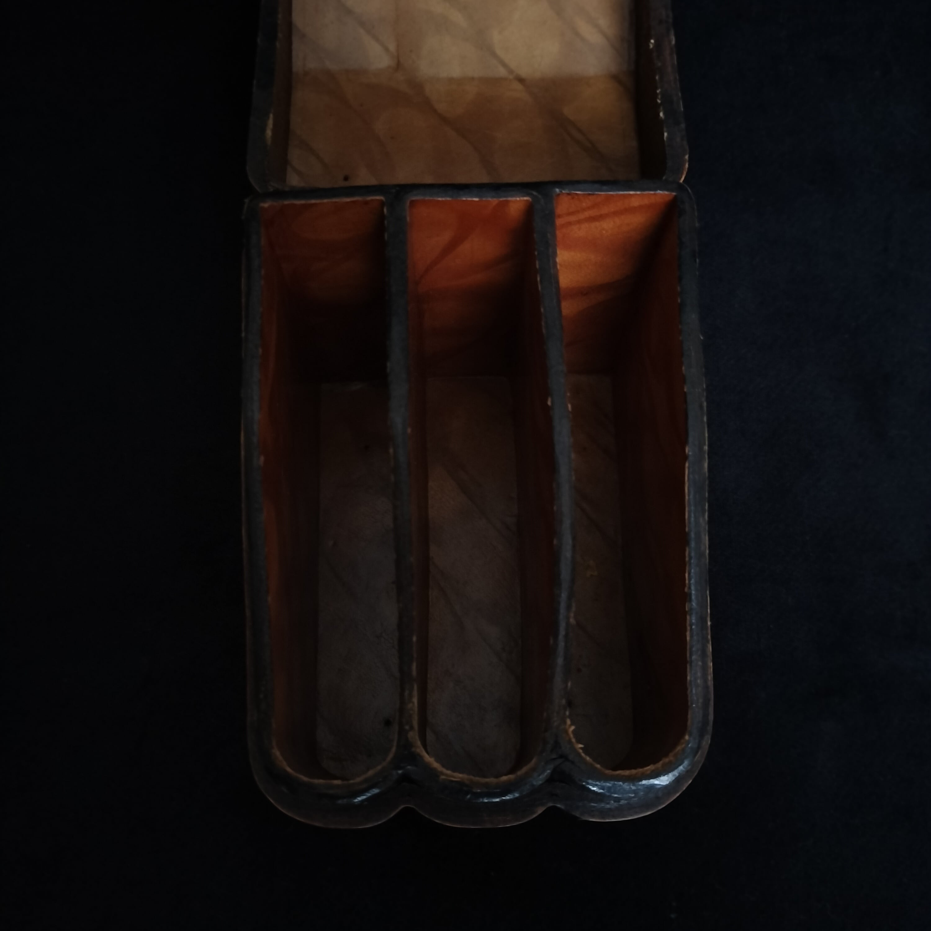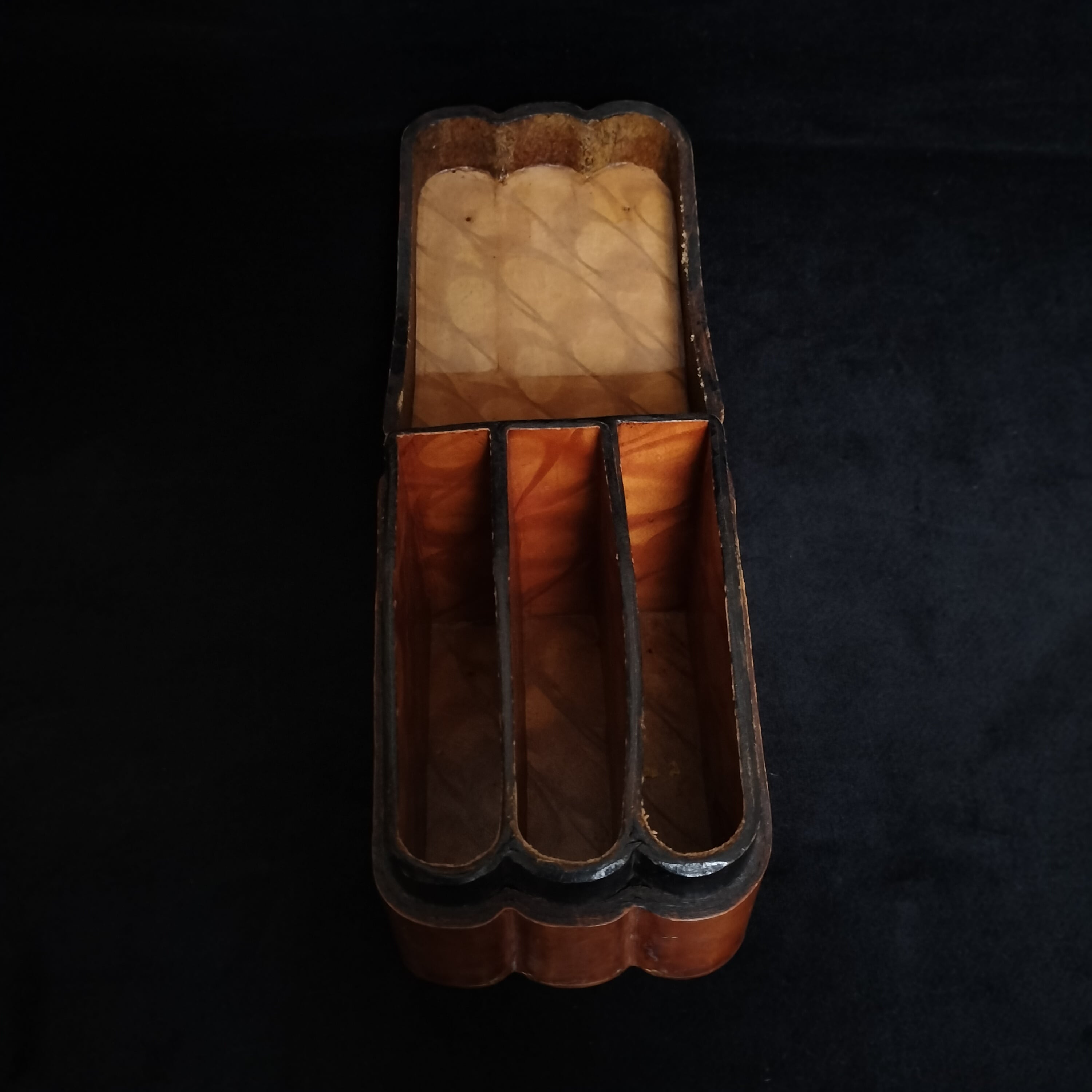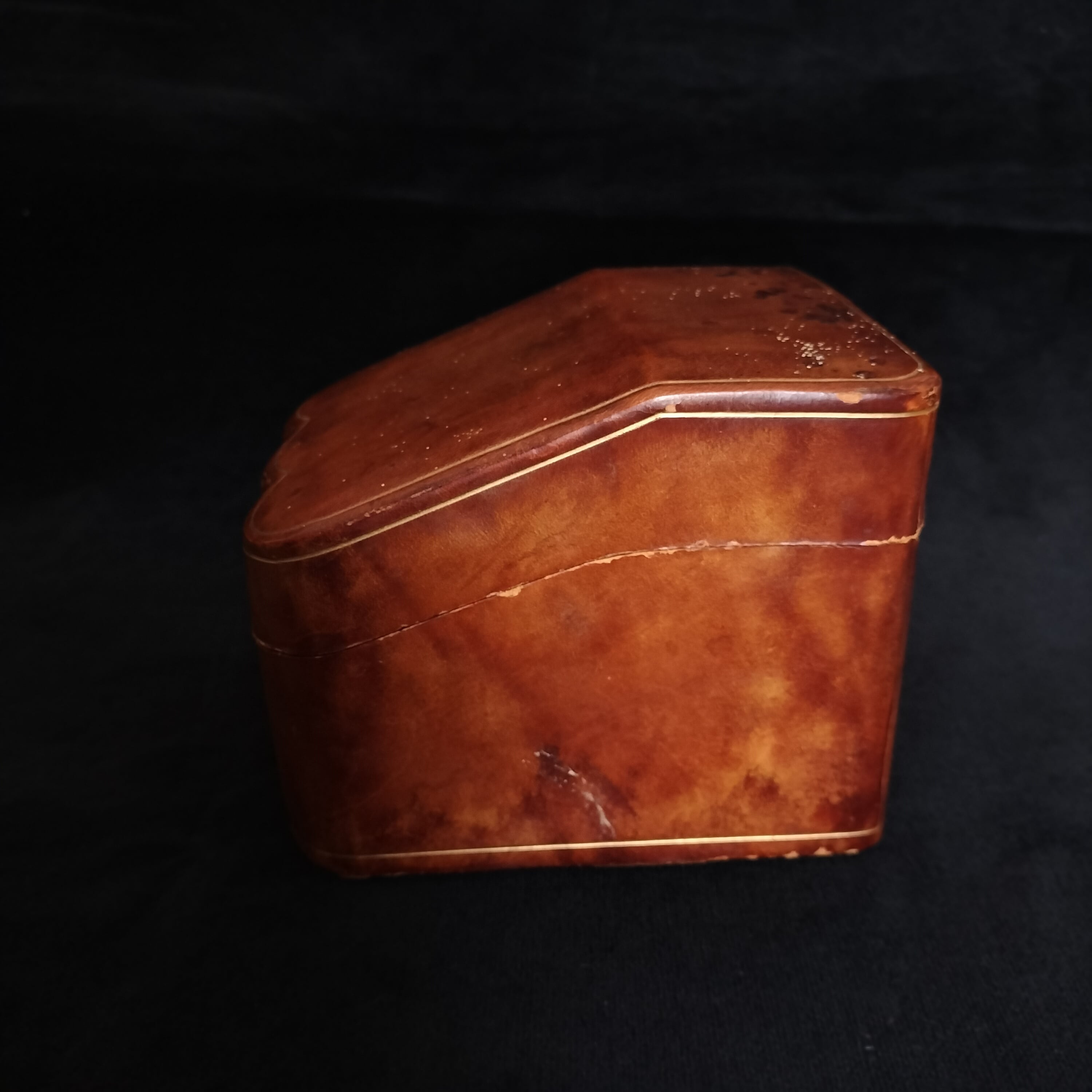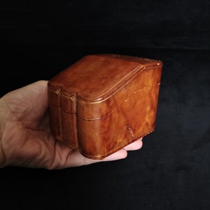 フィレンツェの伝統的な技術に合わせて、木製の本体にカーフレザーを貼っています。金で飾りのアクセントがあり、独特な形をしているボックスです。