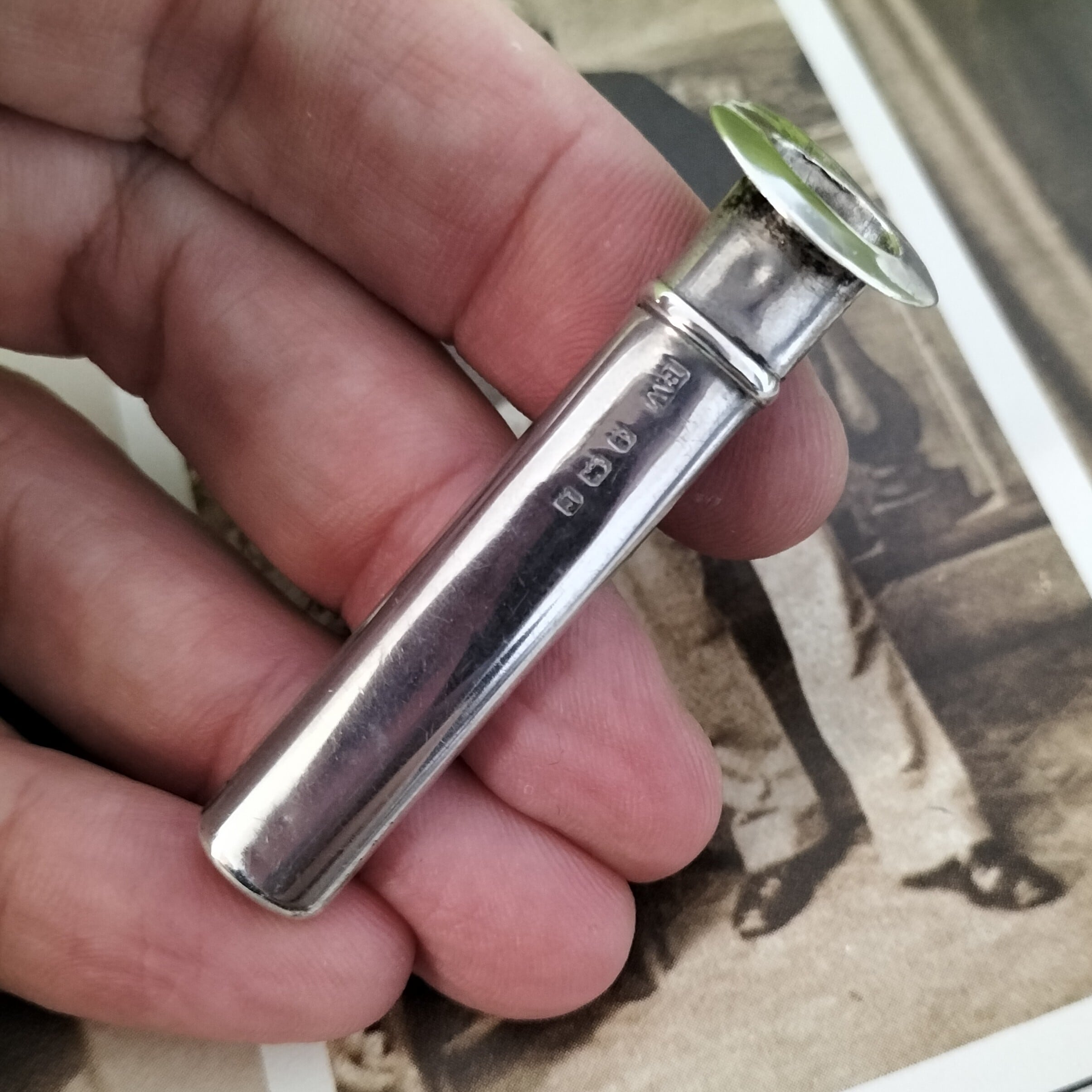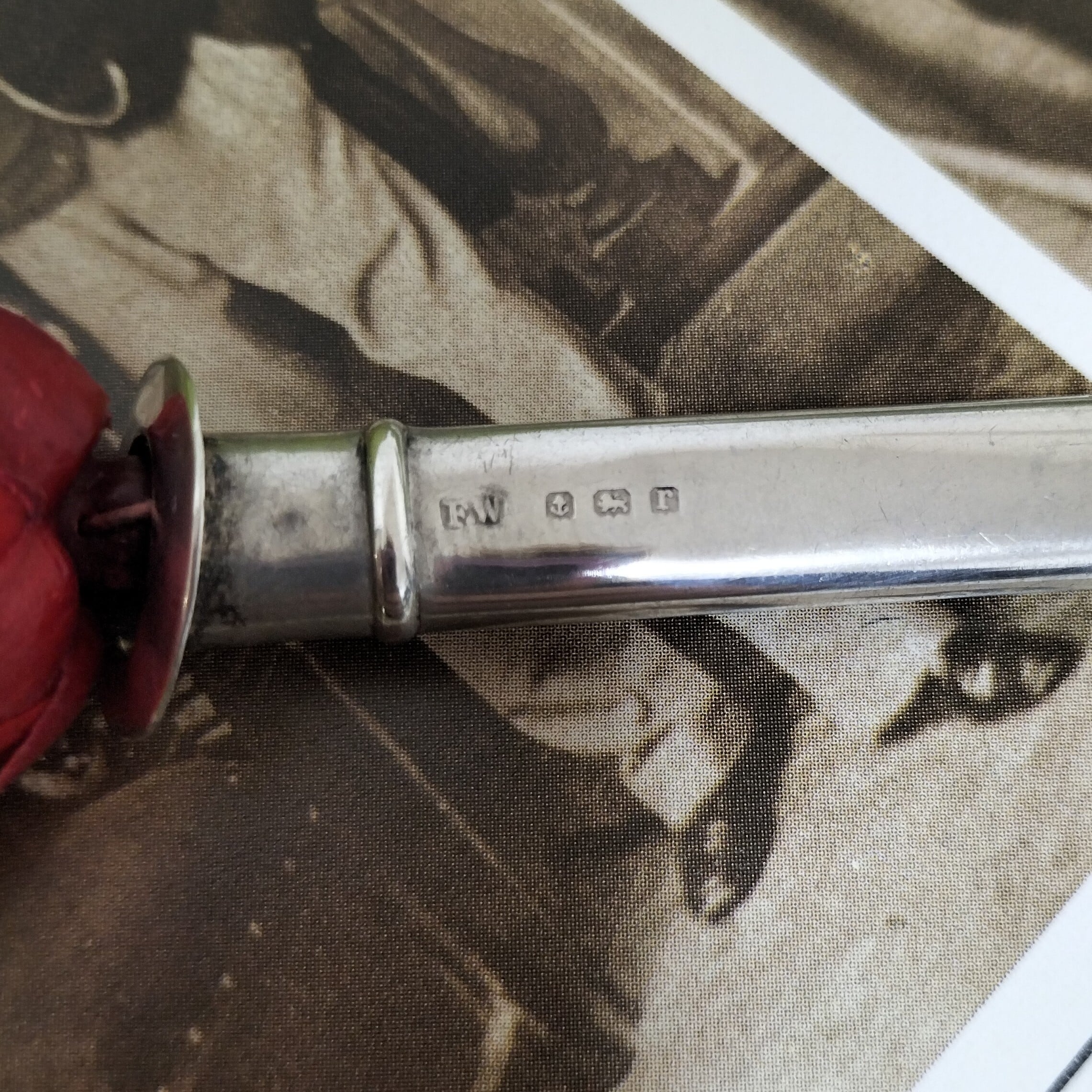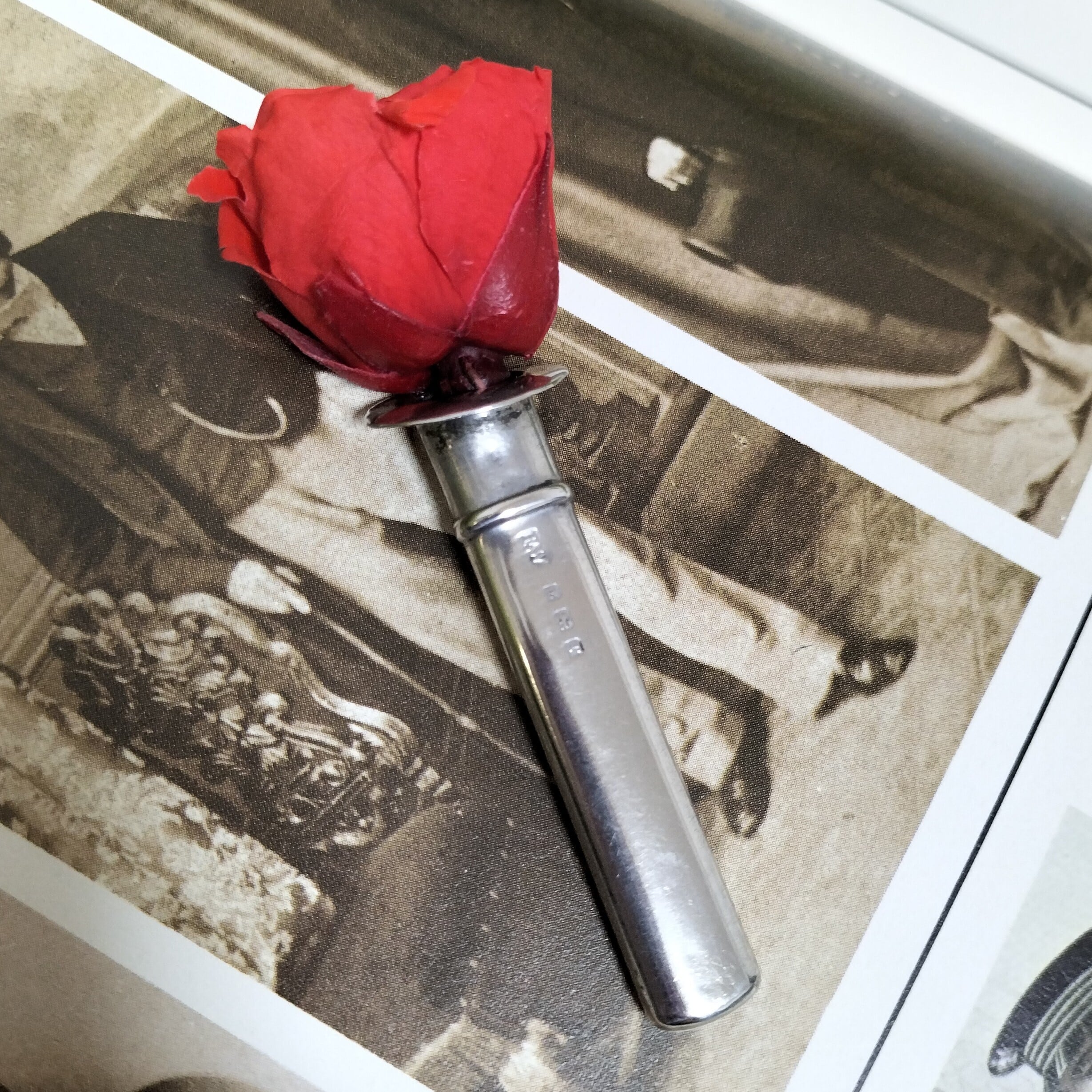ラペルに刺すと、ラペルの後ろになります。刻印から、1916年イギリスのバーミンガムで作られました。