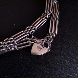 ハート型の南京錠留め具の裏側とゲートリンクの裏側には、製作者のイニシャル「AWF」、日付「g」(1981年)、ライオン・パサント(スターリングシルバー)、バーミンガム検定所のマーク(アンカー)が刻印されています。