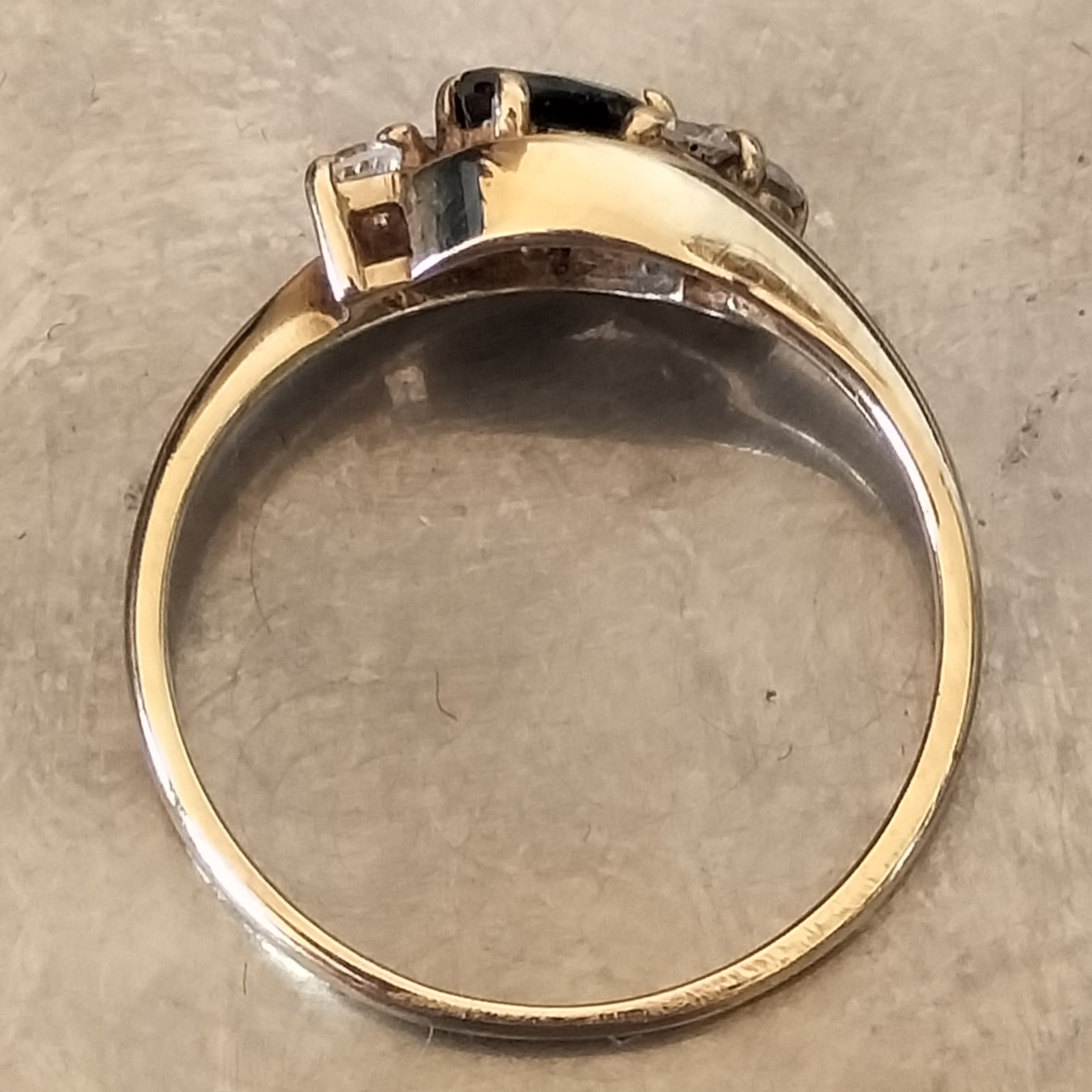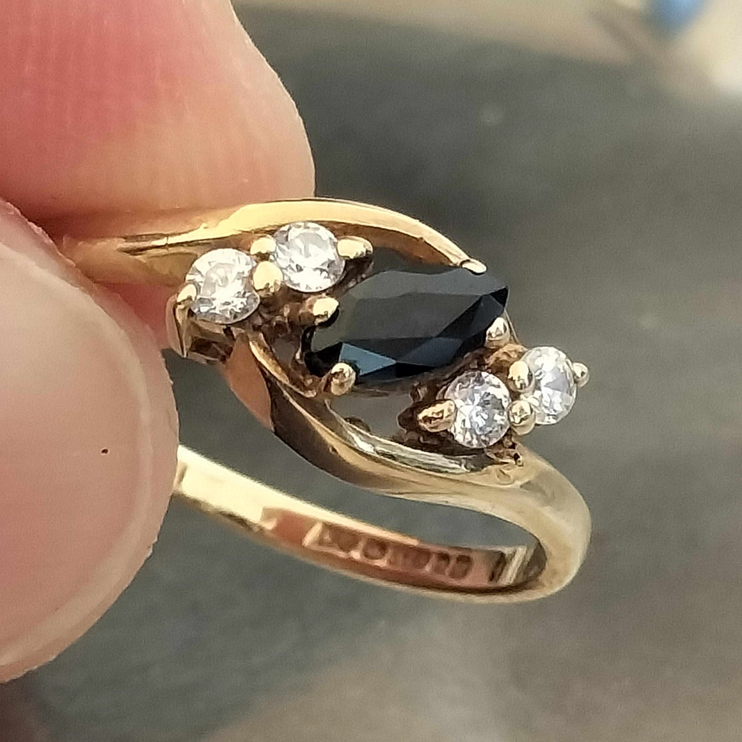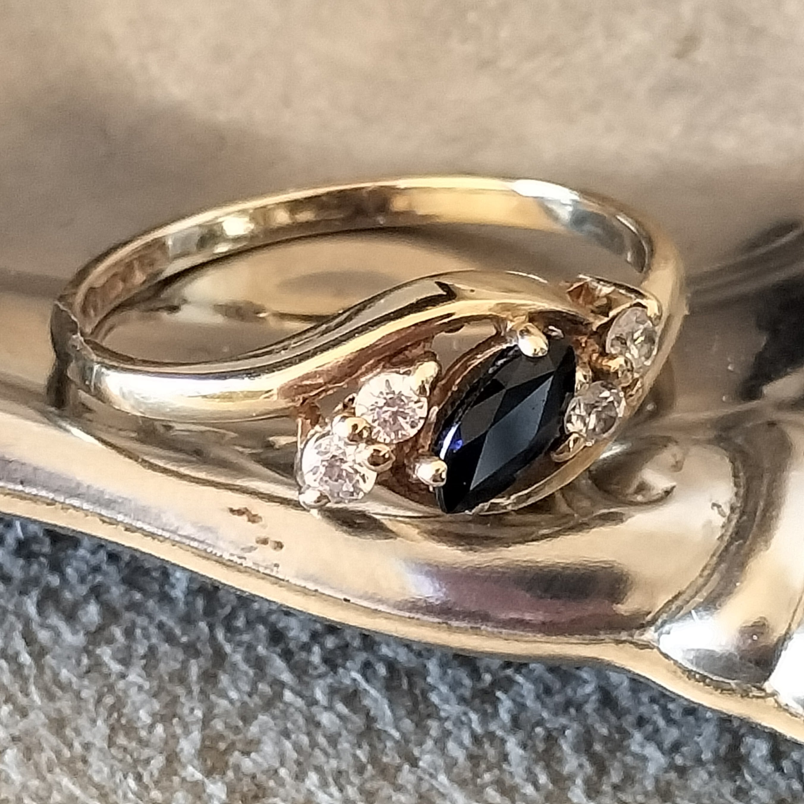 イギリスの9金イエローゴールド製のブラックサファイヤとジルコニアのリングです。