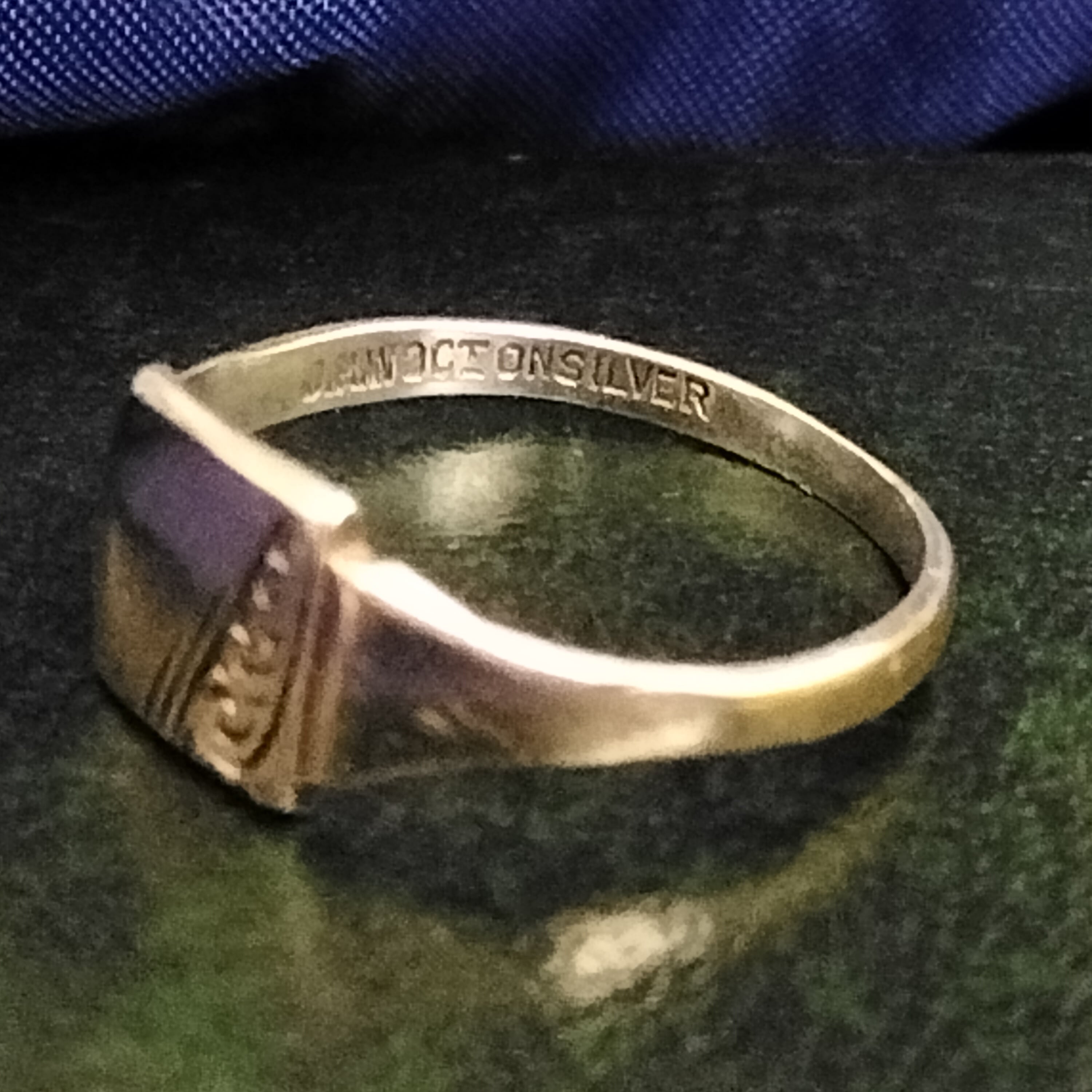 リングの内側にあるホールマーク(刻印)より、 シルバー製の本体に9金ゴールドの外側のコーティングがあります。