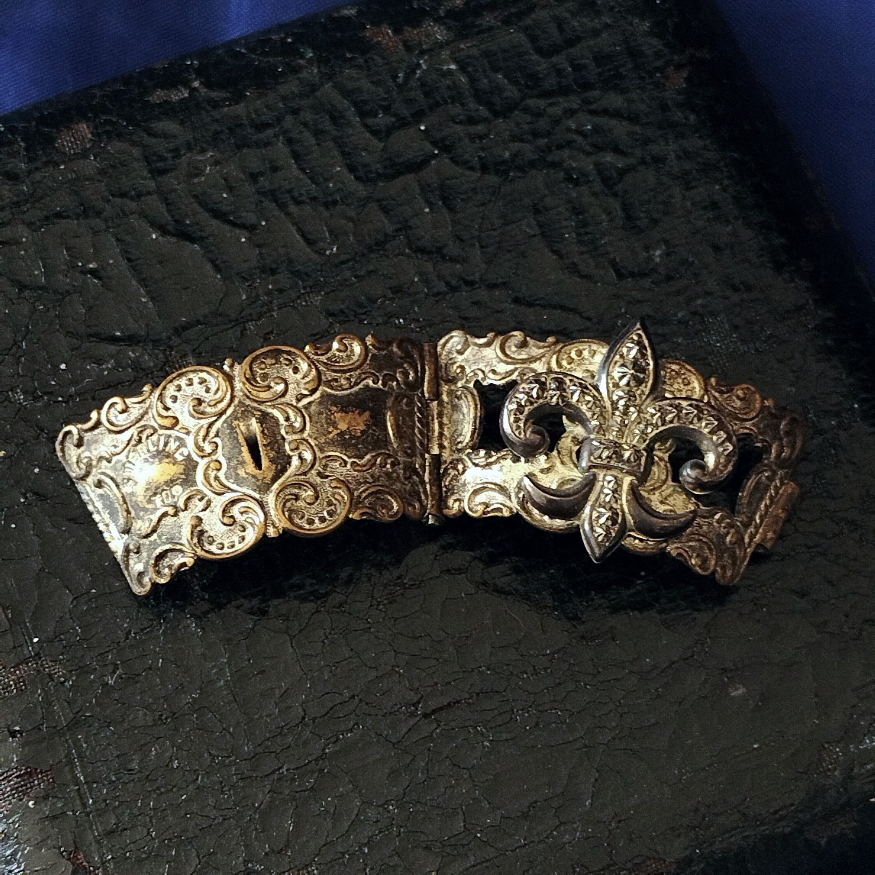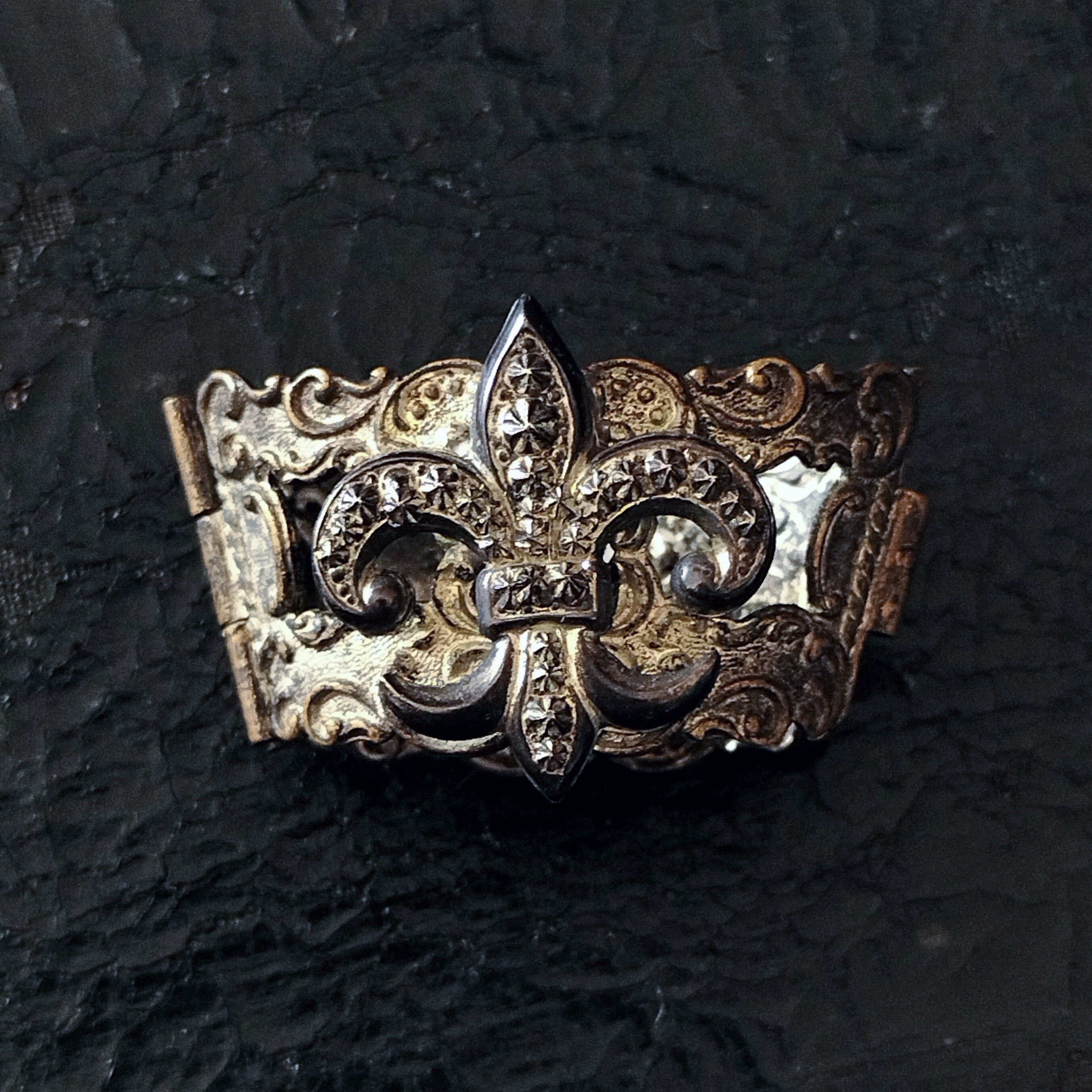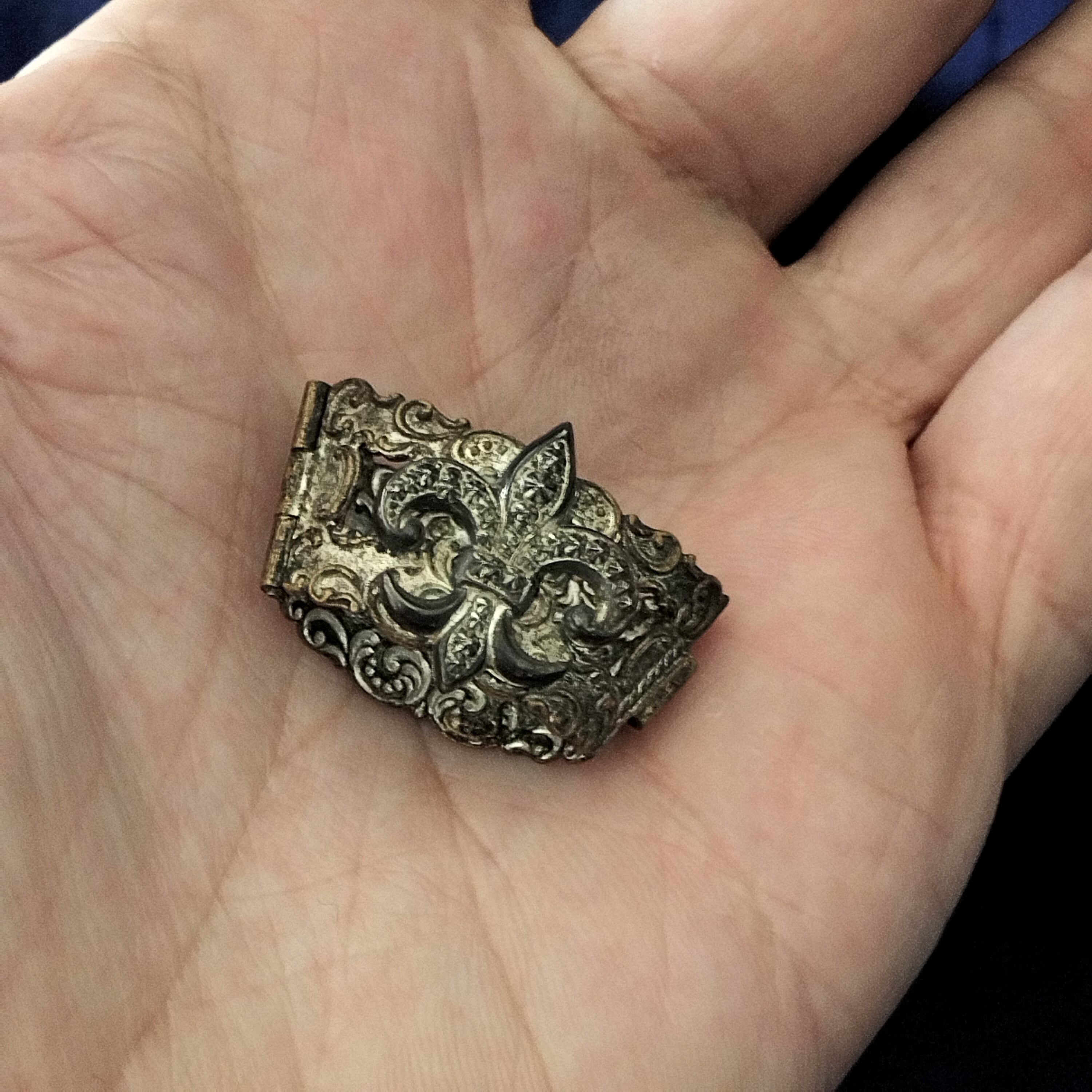 ユリの花のセンター見ると、フランスのスカーフリングだと思われますが刻印は英語になっていますのでどこの国のアイテムが不明です。カナダからの仕入れですのでフランスの文化と英語の文字の合わせと考えたらカナダ製の可能性もあるでしょうか?