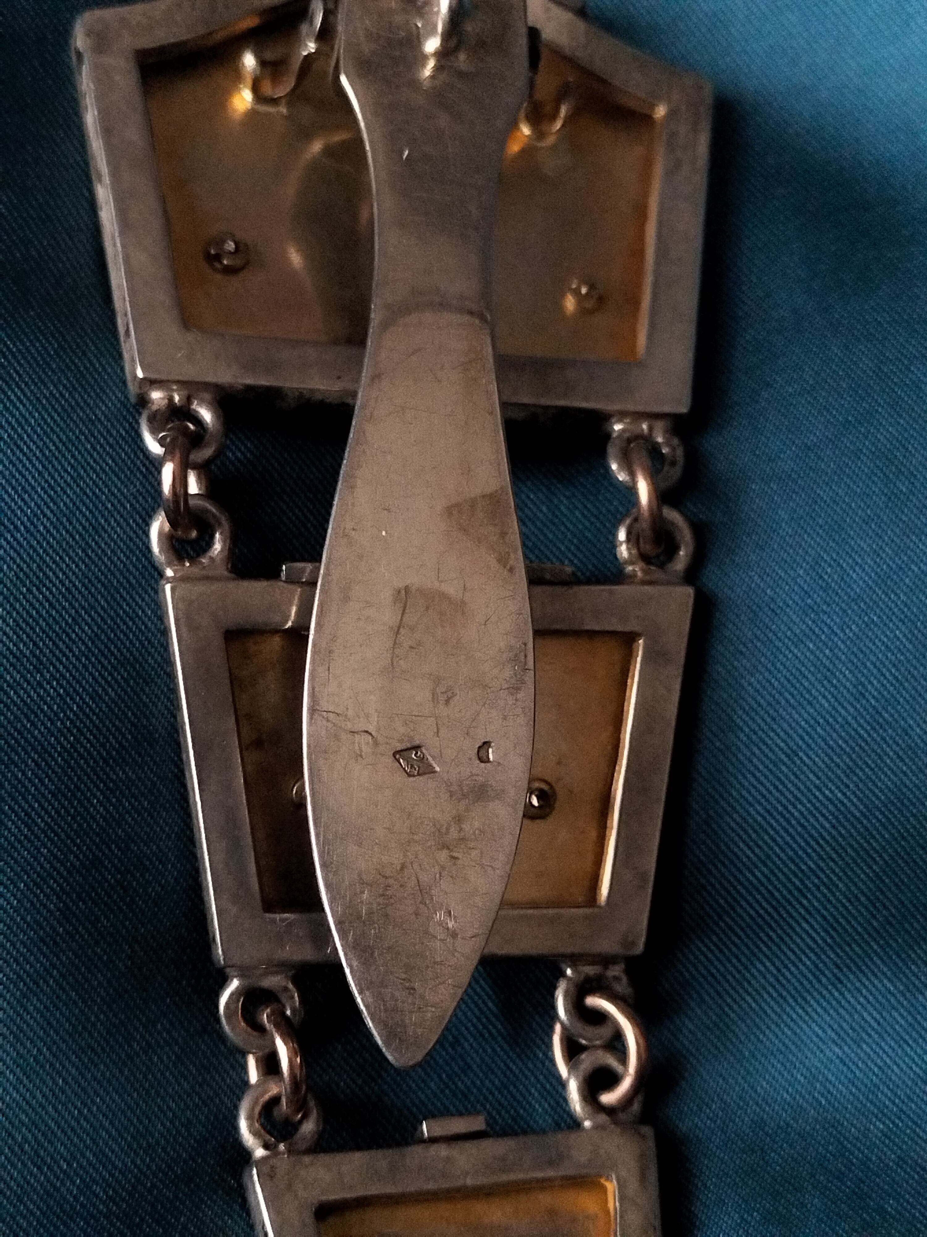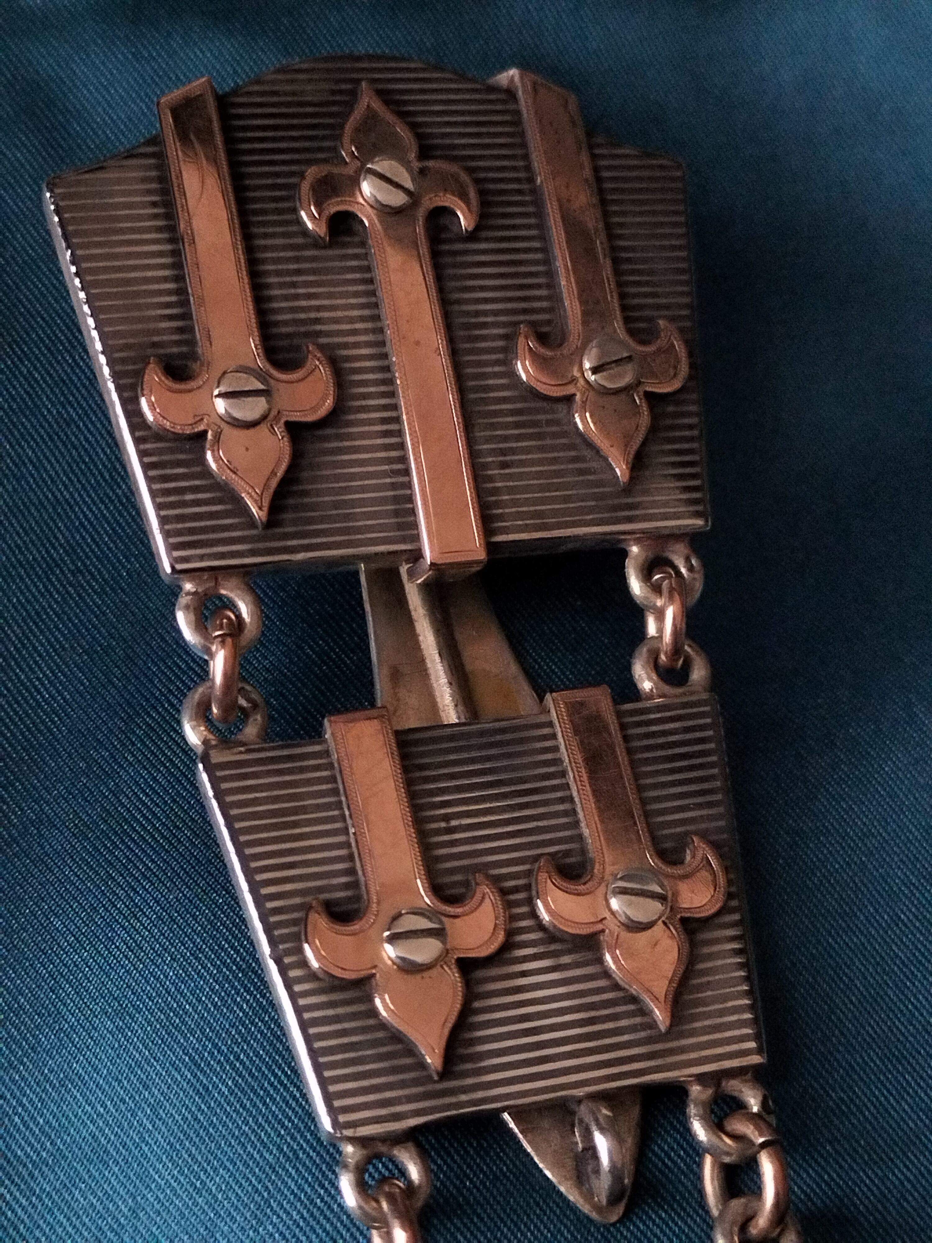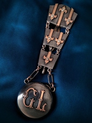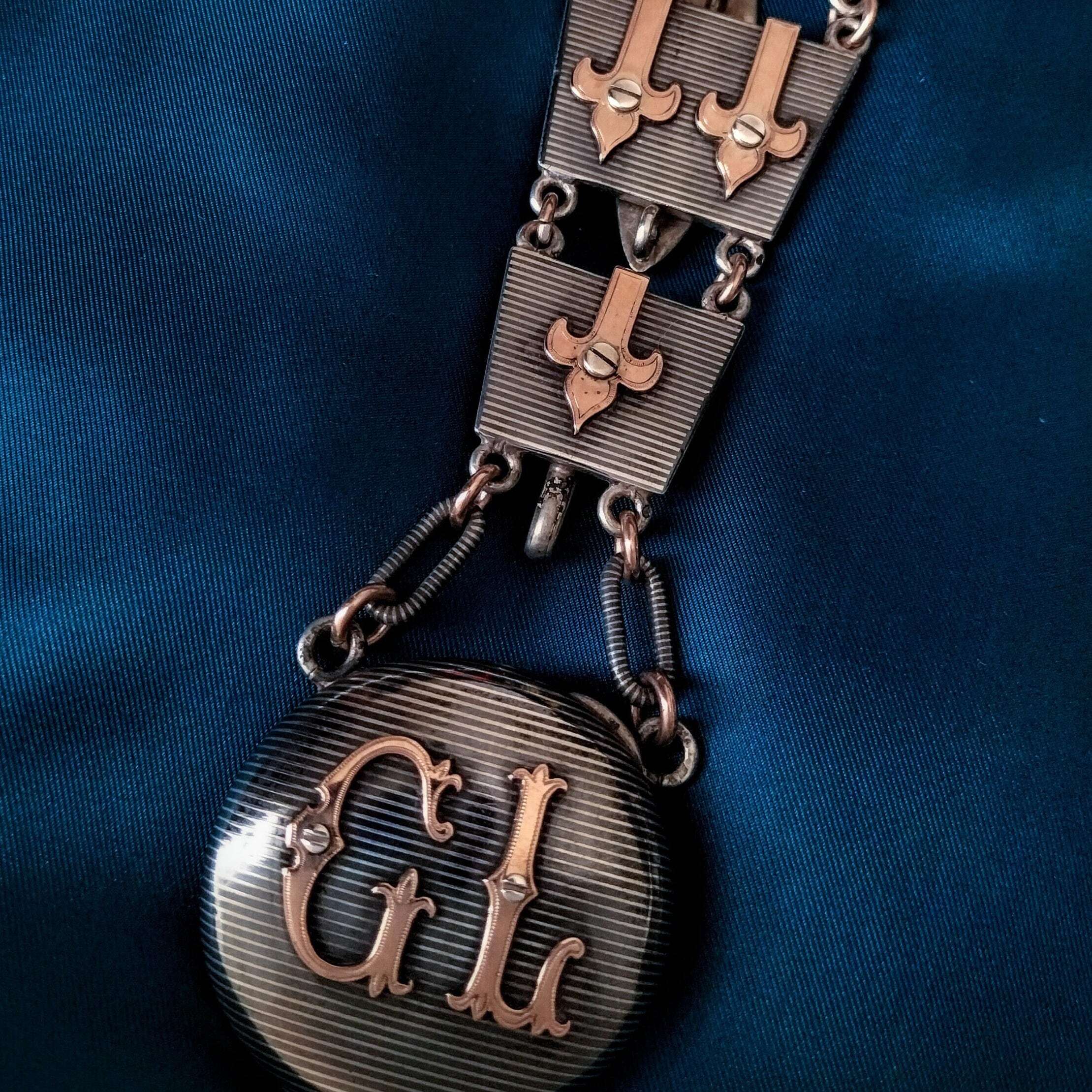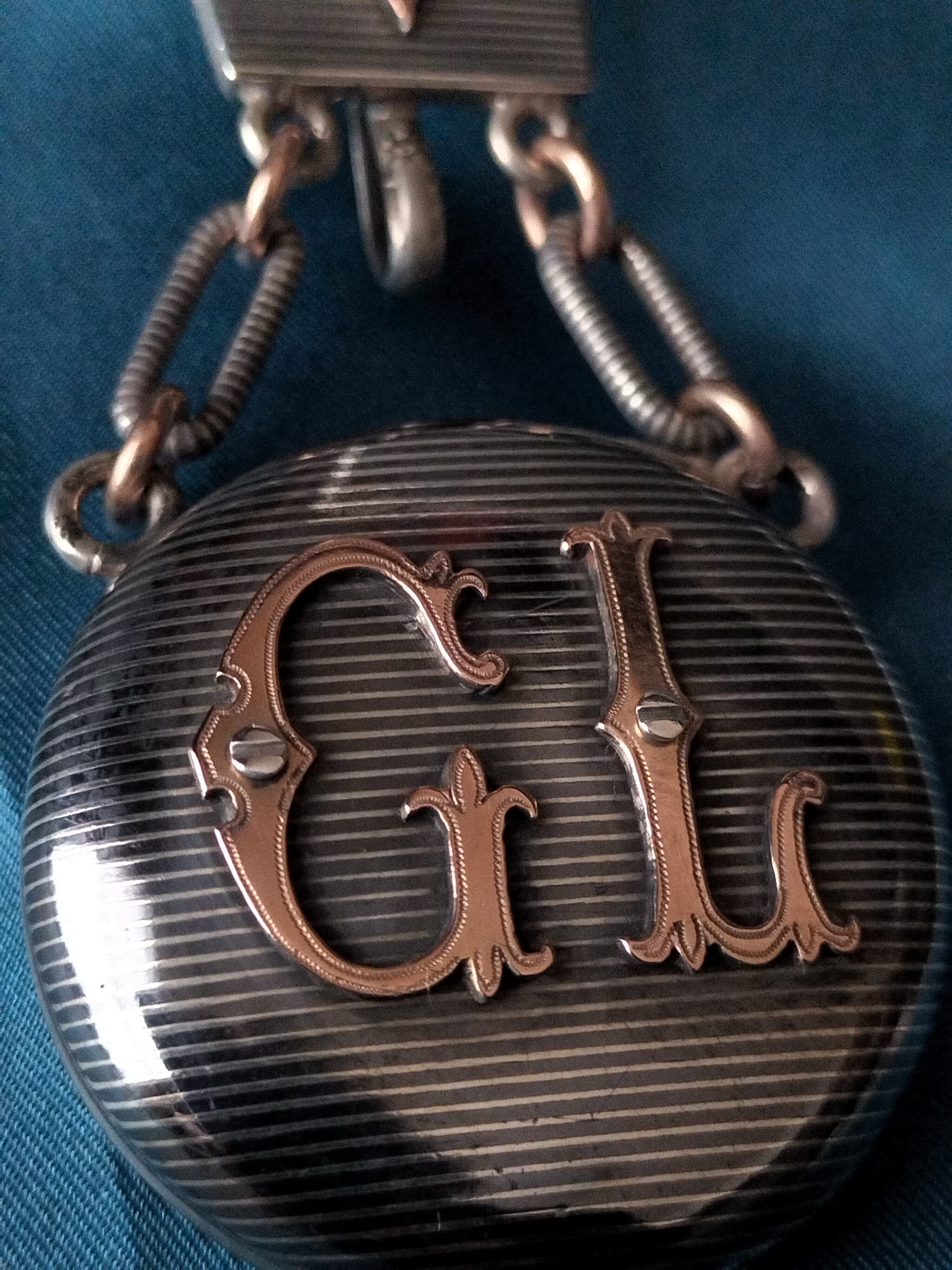 とてもレアな全体シルバー製ウォッチシャトレーンですがさらにニエロの仕上げされたモノです。ストライプのニエロにゴールドヴェルメイユーのイニシャルと他の飾りが素晴らしいコントラストしています!