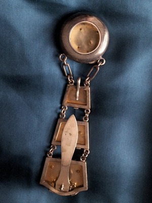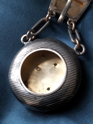 18世紀〜19世紀末人気があったレディースのアクセサリーです。ほとんどポケットがない時代でしたので、ベルトかスカートに挟んで、チェーンとフックで様々な道具(ソーイングセット、時計、小物入など)をおしゃれに持ち歩けるファションアイテムでした。こちらのシャトレーンは懐中時計のケースとしてです。