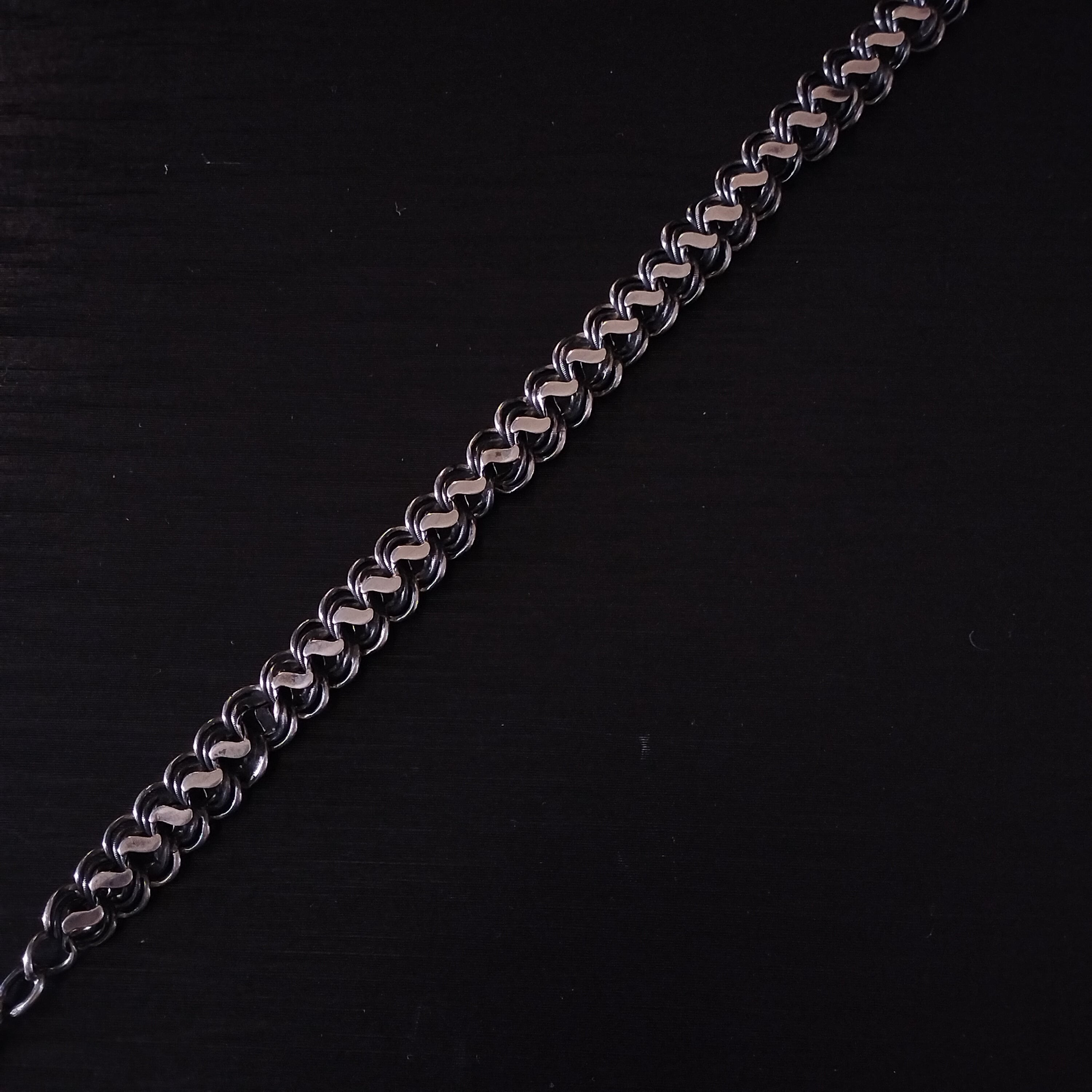 丸いリンクスにも細かい彫りが入っています。その丸いリンクとフラットのリンクスの合わせでクネクネしている珍しいチェーンです!