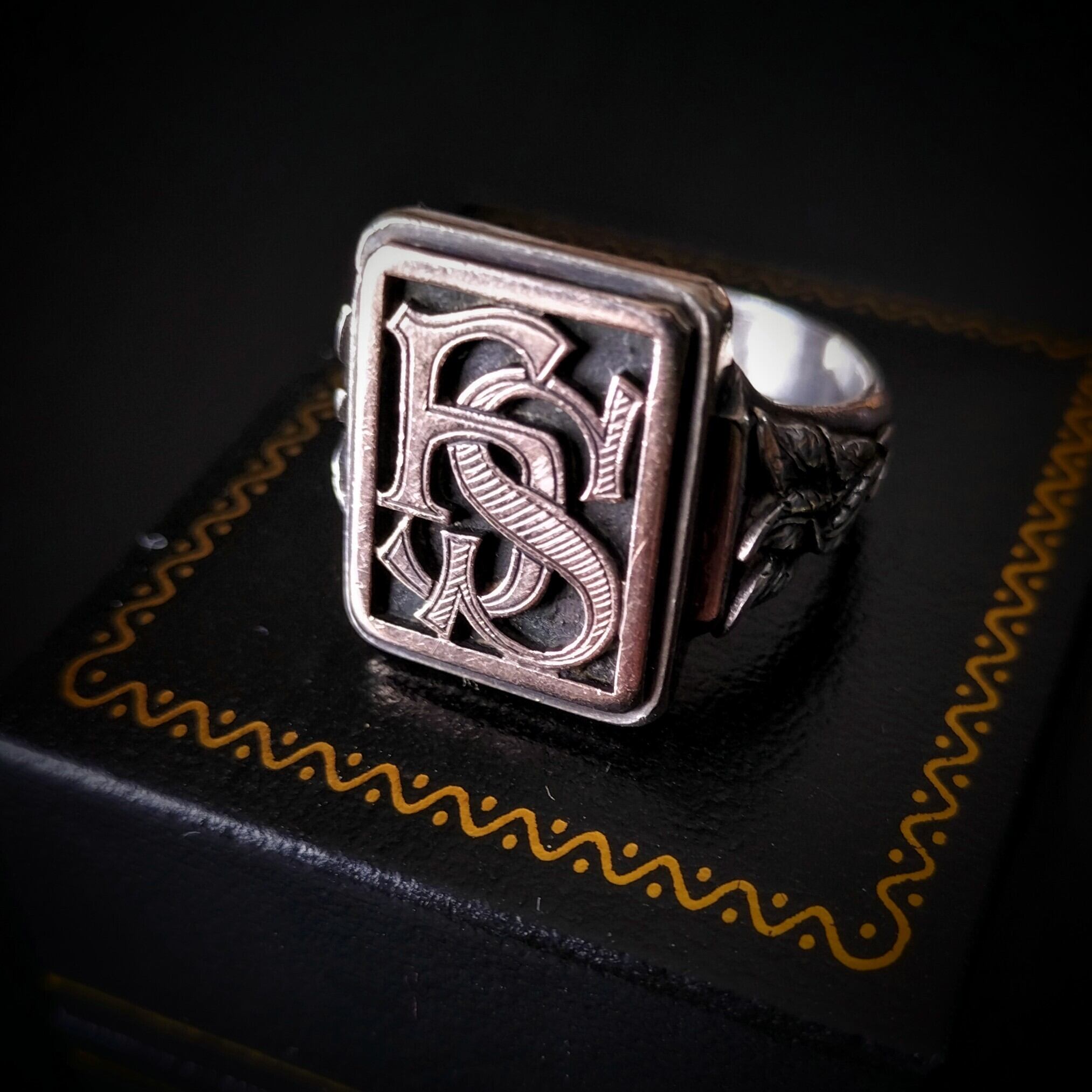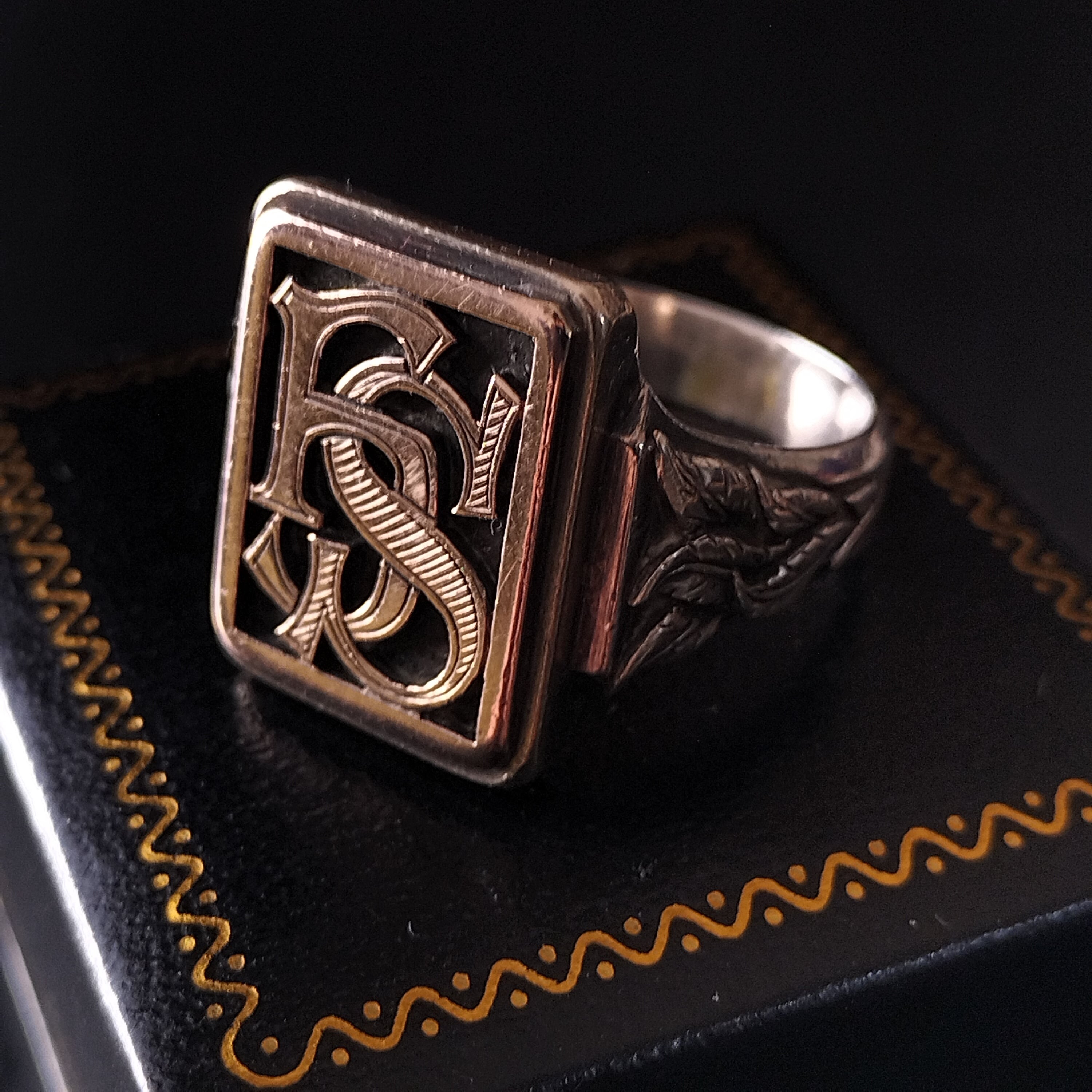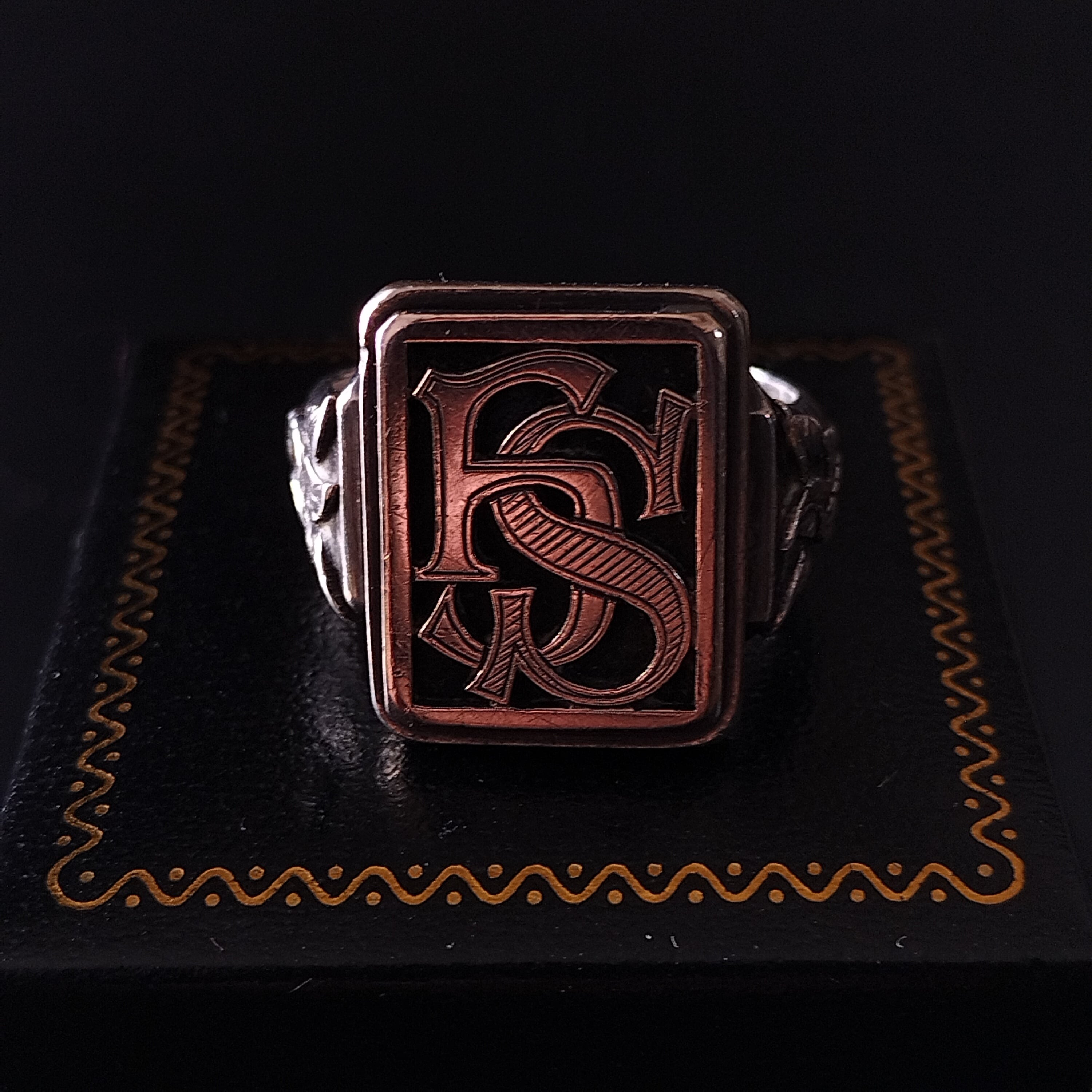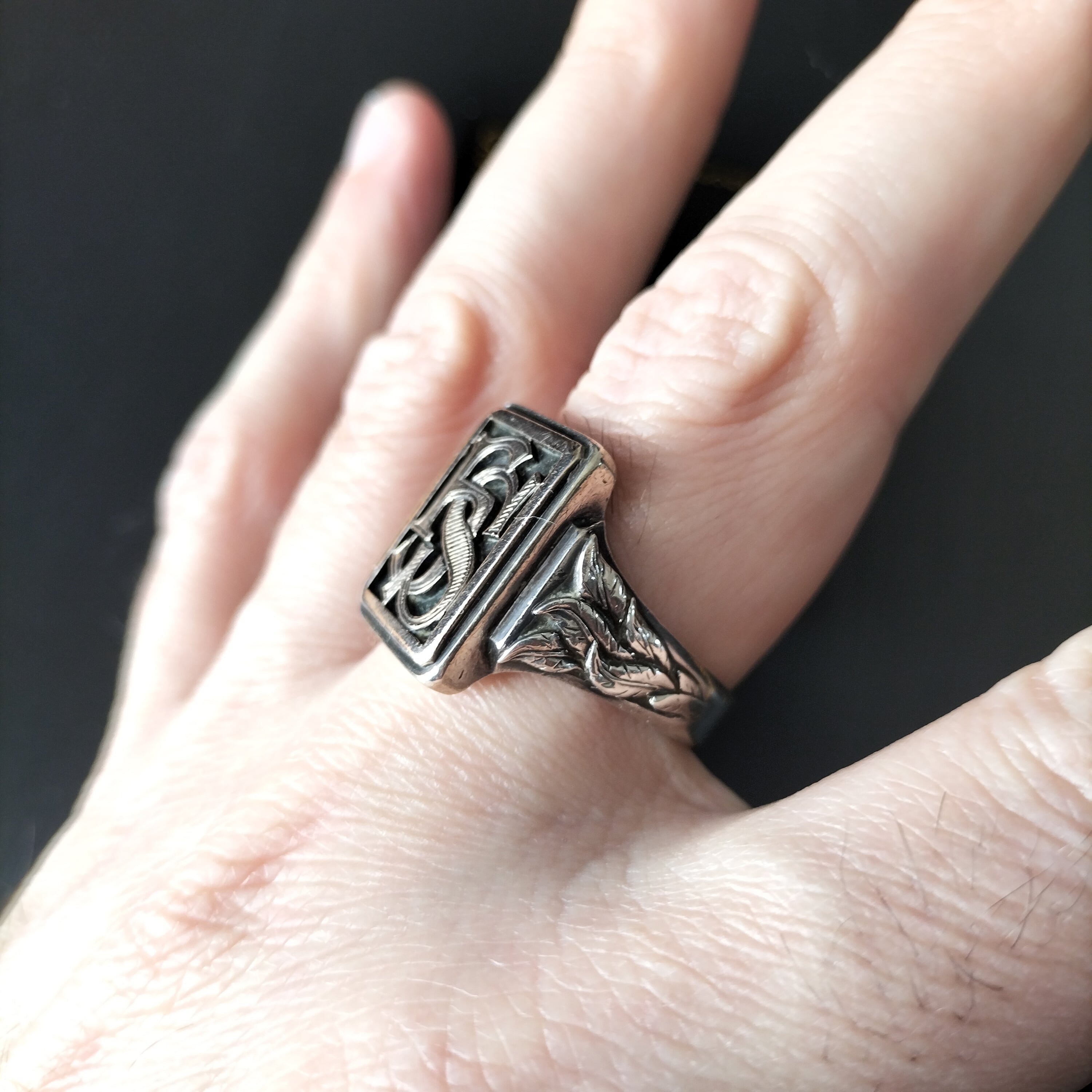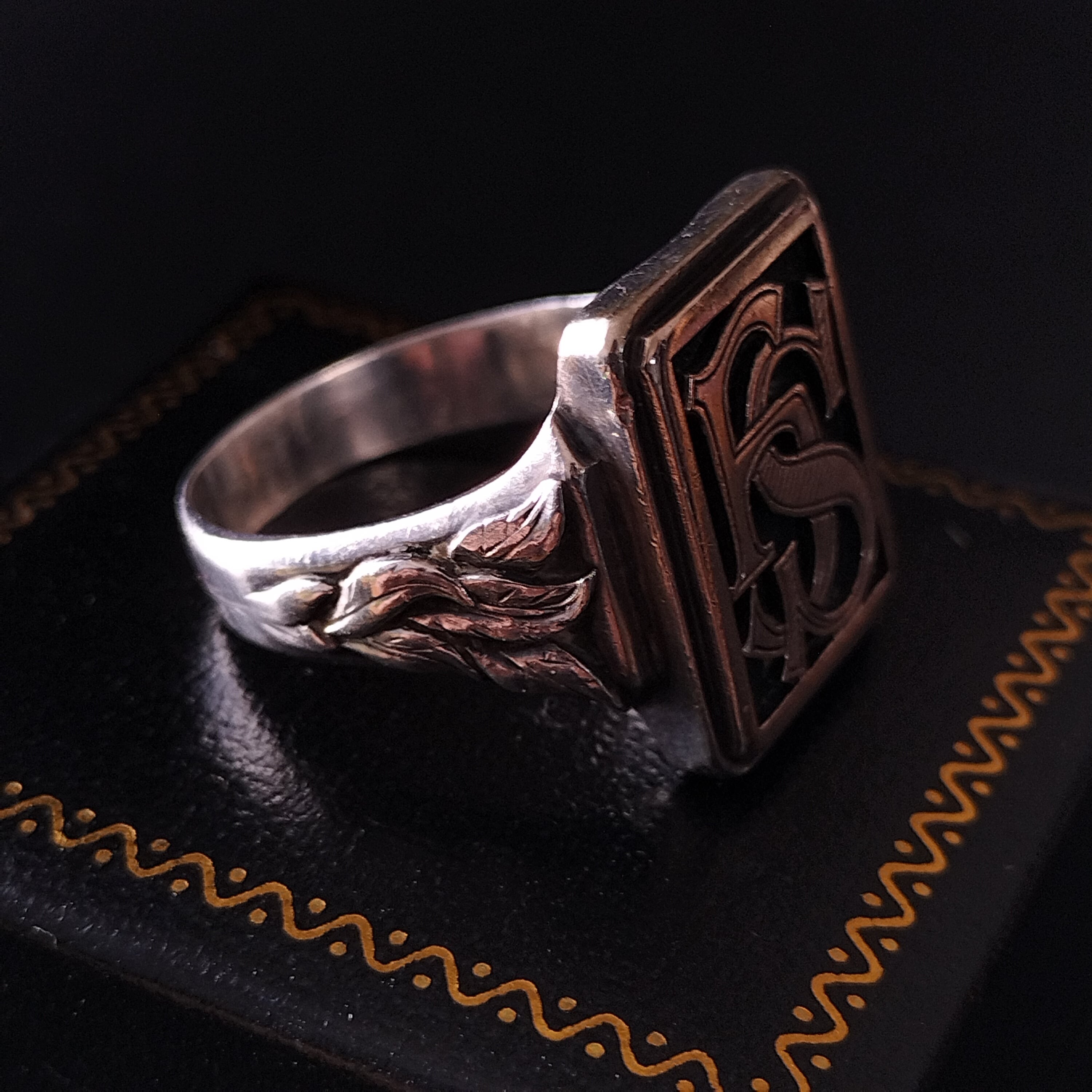 ドイツ製の大きなイニシャルリングです。本体はシルバー製(900の刻印あり)、イニシャルの部分が8〜9金ゴールドだと思われます。同時代のドイツのイニシャルリングの中、レアな形です。16グラムを超えて、重量感もずっしり感じます!