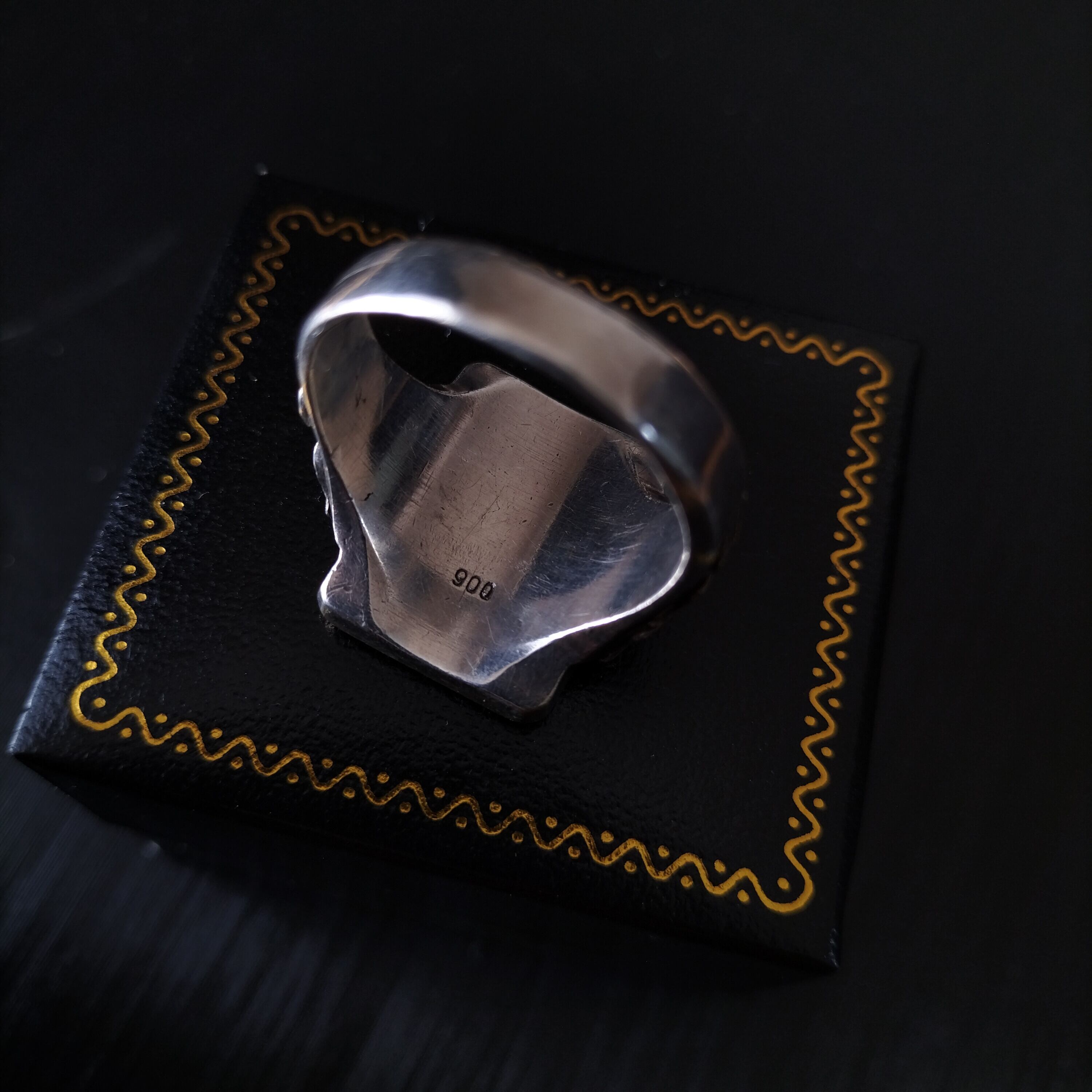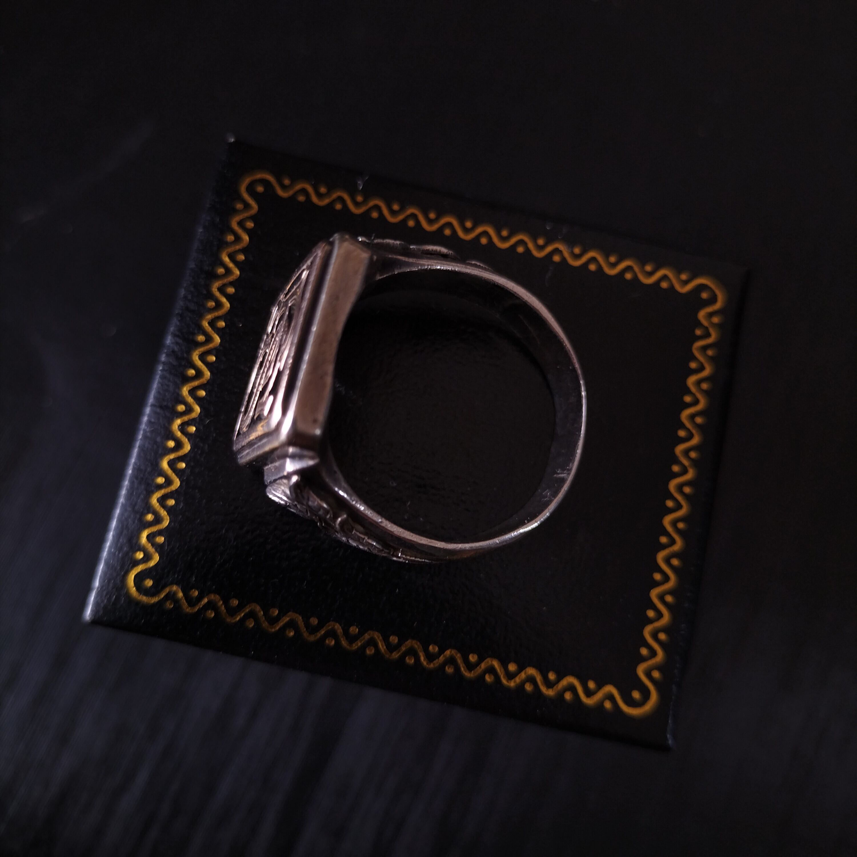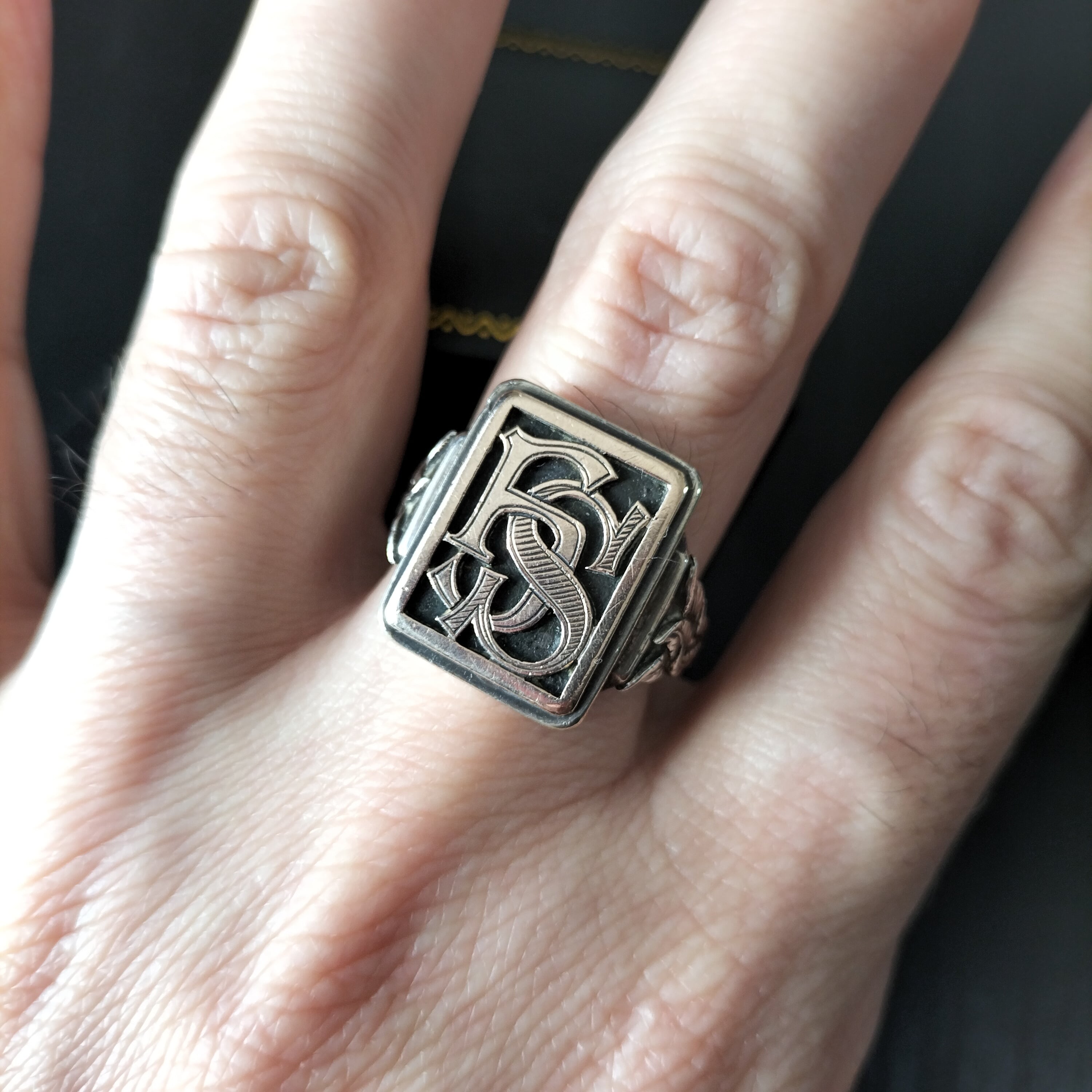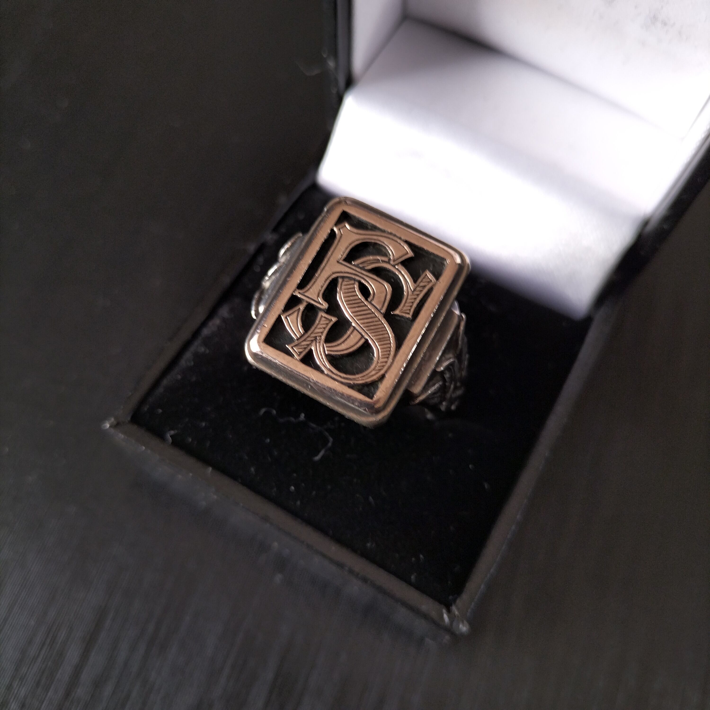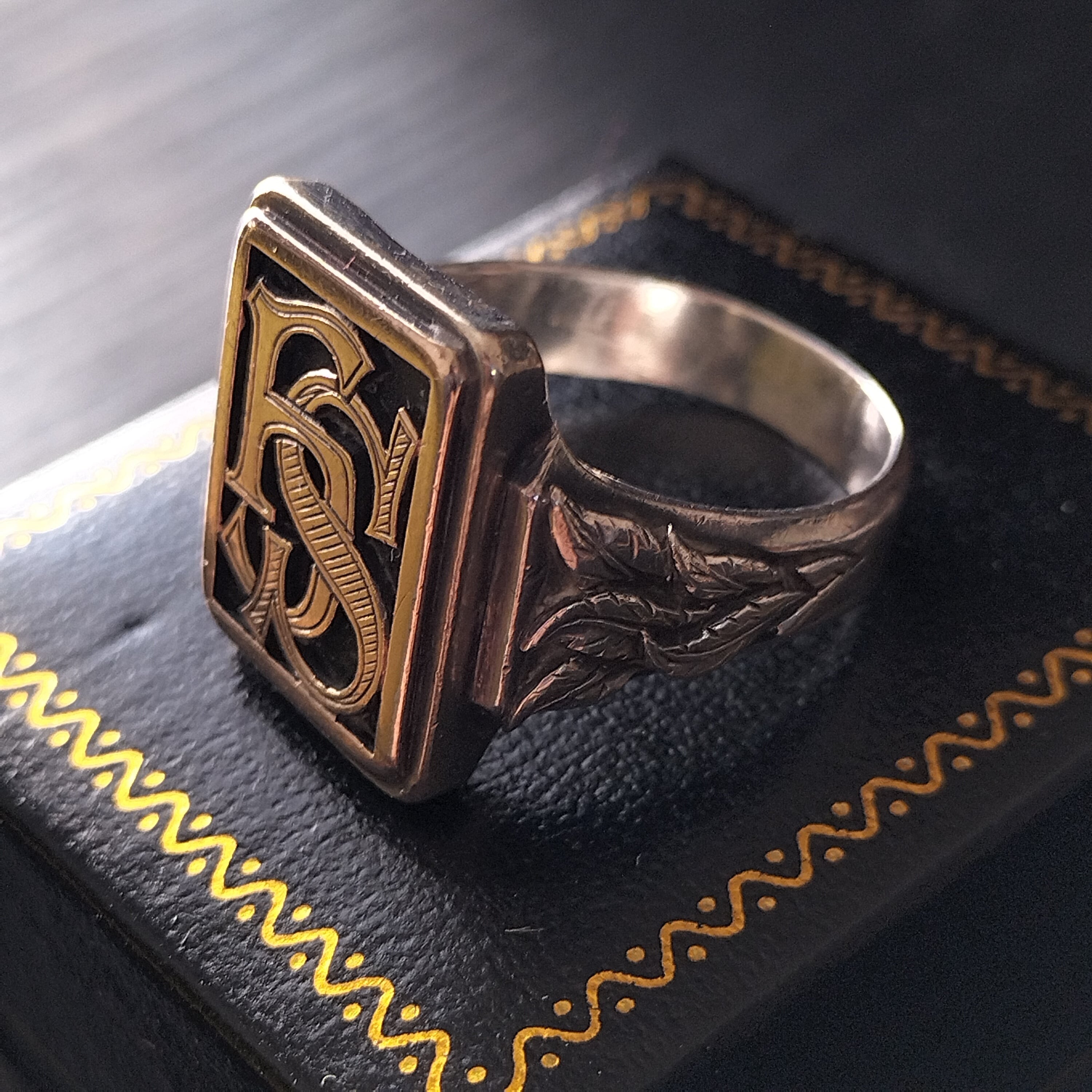 ドイツ製の大きなイニシャルリングです。本体はシルバー製(900の刻印あり)、イニシャルの部分が8〜9金ゴールドだと思われます。同時代のドイツのイニシャルリングの中、レアな形です。16グラムを超えて、重量感もずっしり感じます!