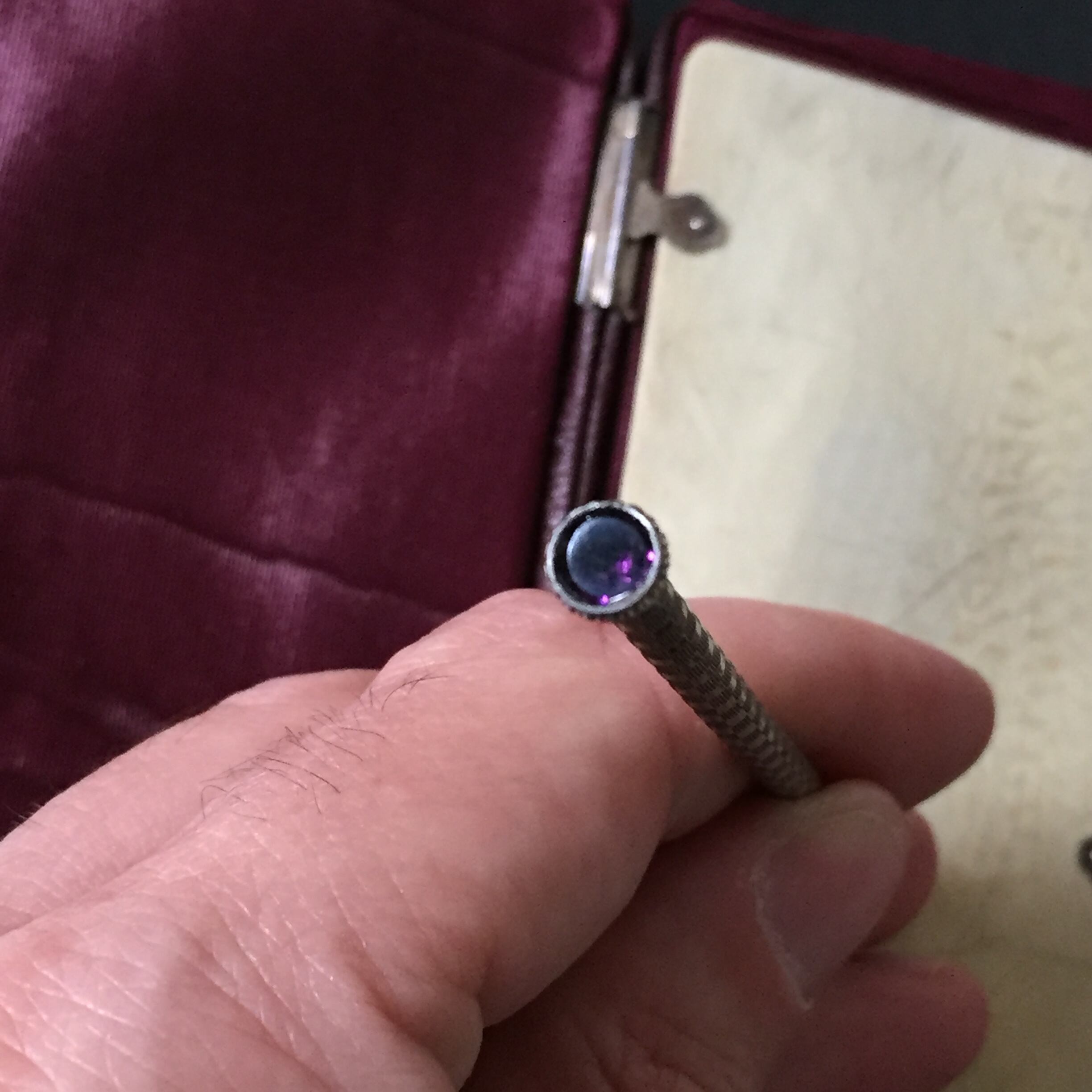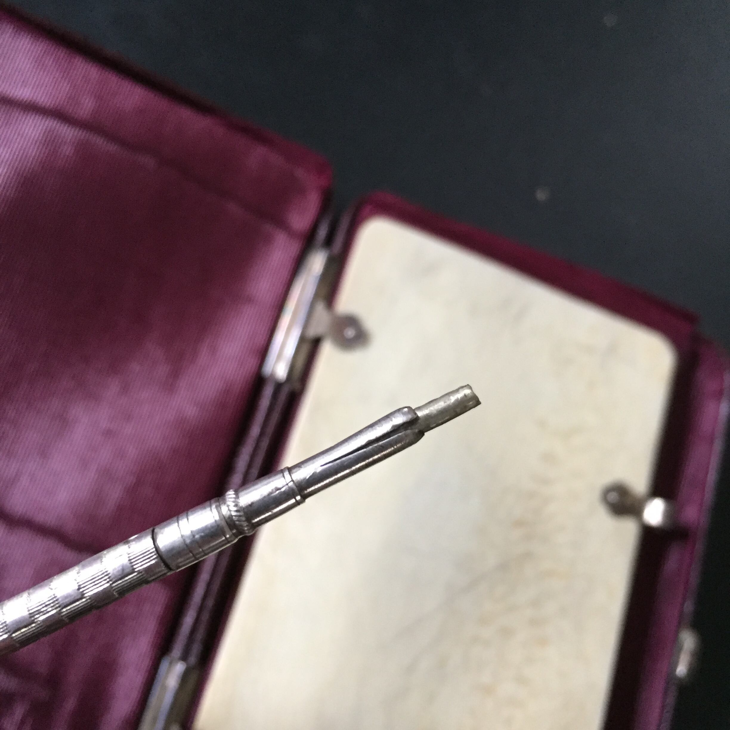 シルバー製シャープペンシルにえんじ色のガラス製の飾りがあります