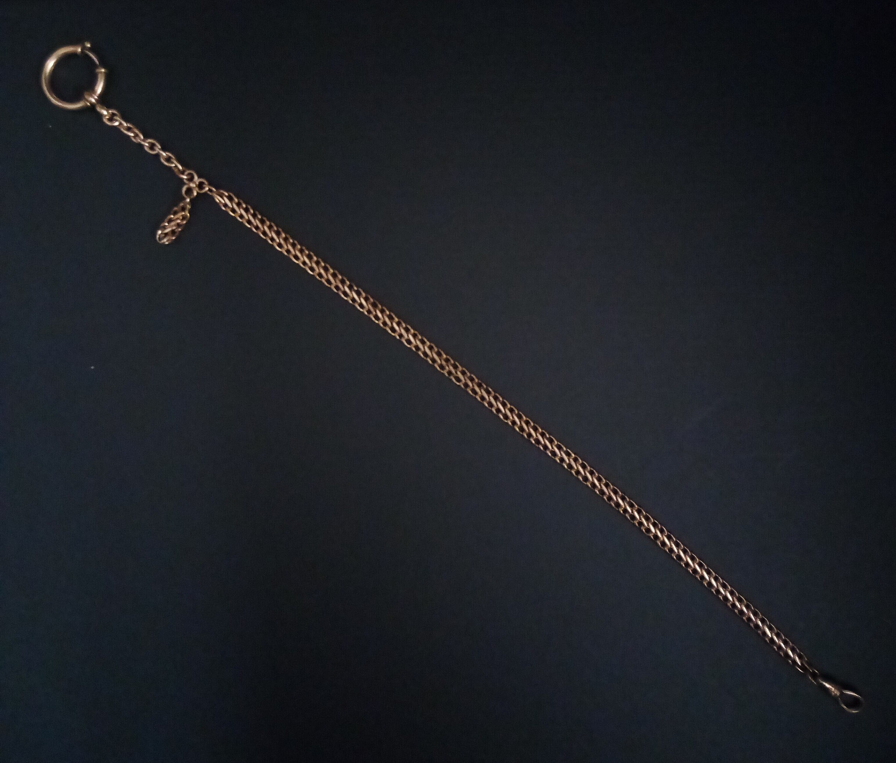 チェーンが3本に分かれています(ボタンホールに付けるリング、時計に付けるクラスプ、ペンダントフォブ用の短いチェーン).とても細かい作りとグッドコンディションなチェーンです!