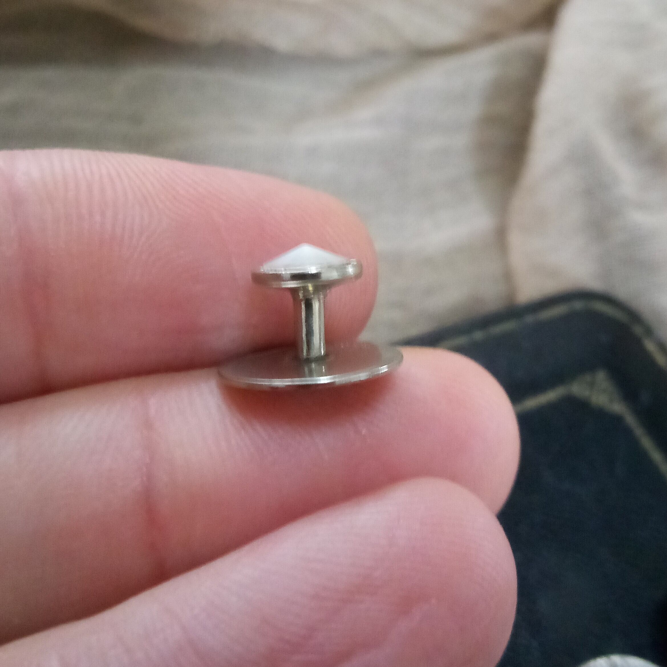 レアなコーン型のマザーオブパールの飾りのカフス(2点)とドレスシャツ用スタッズ(3点)ですので、とても珍しいセットです。カフスの裏側がイエローゴールドの金張りです。カフスとスタッズの周りの飾りがホワイトゴルドの金張りだと思われます。