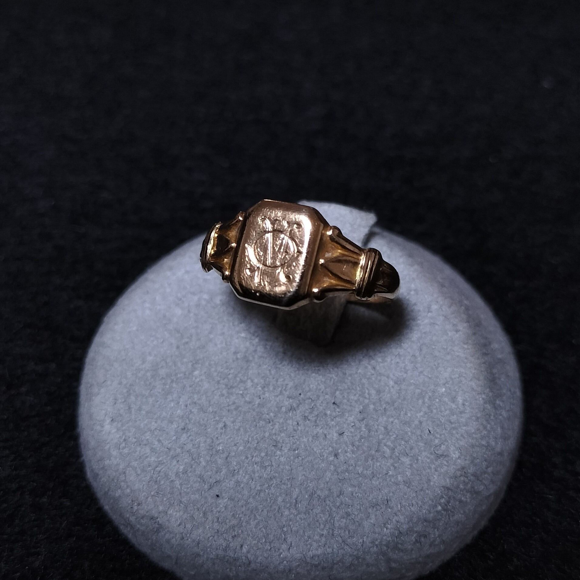 とてもおしゃれな作りのシグネットリングにイニシャルのエングレービングがあります(アルファベットのMとO)。