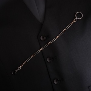 シルバーのチェーンの一つずつの輪にニエロの細かい線とヴェルメイユのメッキがあります.リングとフックにもニエロの線があります.細い作りのチェーンなので,ニエロが付いている懐中時計,または他の小さな道具(シャープペンシル,ポケットナイフなど)におすすめです.シルバー「800」の刻印があります。